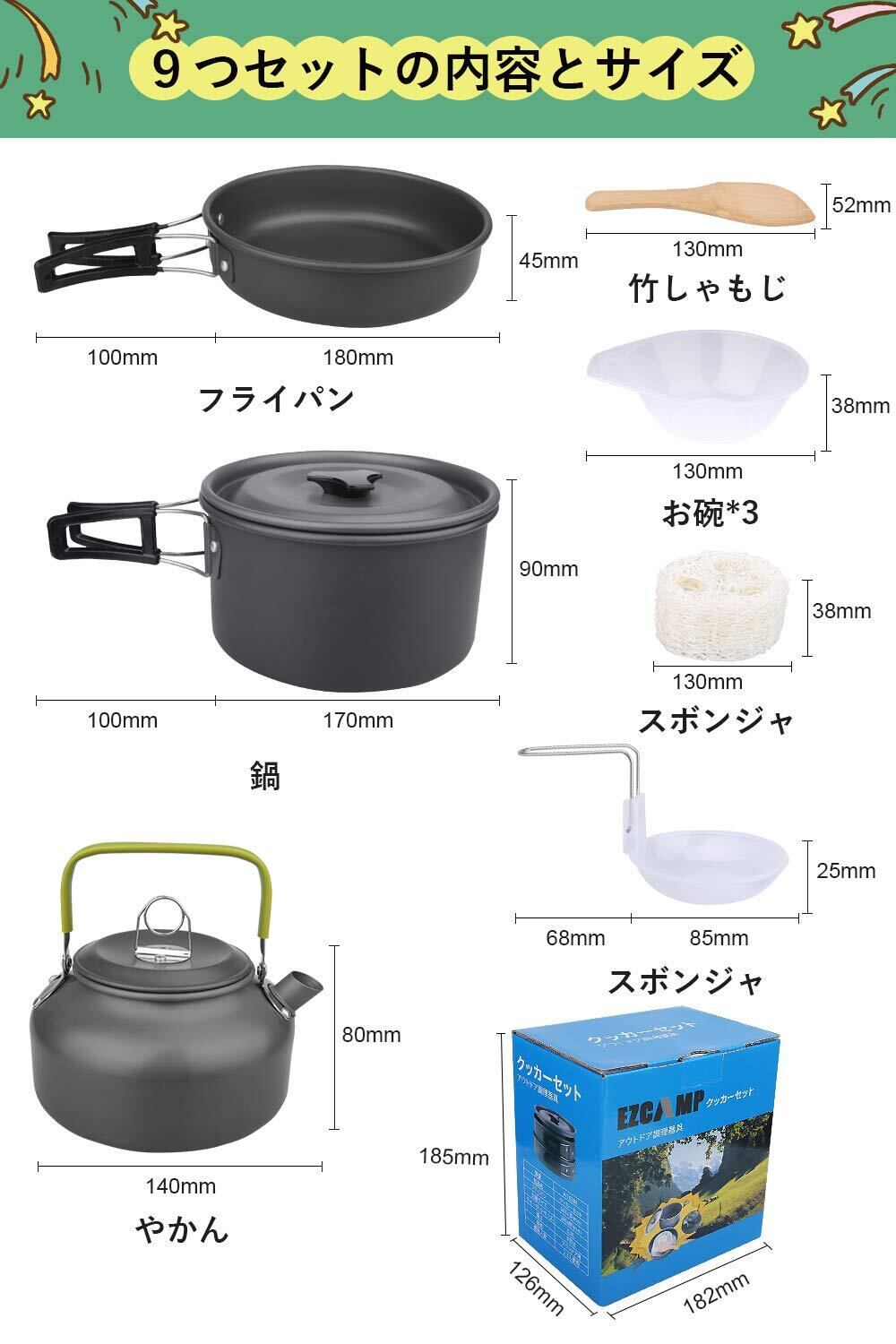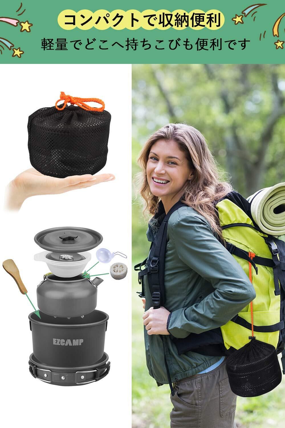 キャンプクッカー アウトドア9点セット EZCAMP 防災 登山用鍋 Bbq食器 ステレンス製 小型 軽量 収納袋付き 2-3人に適応