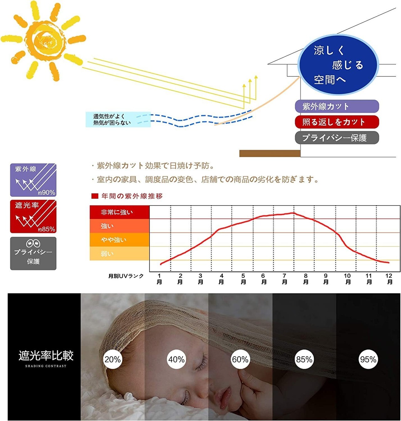 通気性がある素材で、熱気がこもらず、遮光率85%で日差しと紫外線をカットすることで省エネ効果も期待できます。窓の外に組み立てたら、部屋の温度は即下げることができます。外から見えにくくなり、日差しと視線を遮って、涼しく快適にお過ごしいただけます。