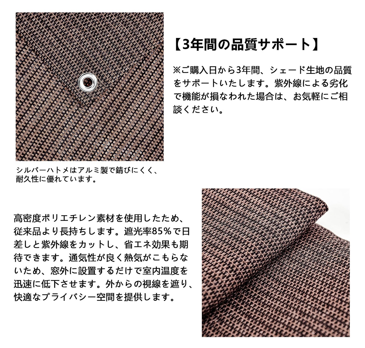 素材:耐久性に優れた高密度ポリエチレン使用。【3年間の品質サポート】:お買い上げの日から3年間、シェード生地のみに対するサポートとなります。紫外線放射による生地の劣化の為に商品が破れ、日よけとして機能を果たさない場合をサポート対象としています。