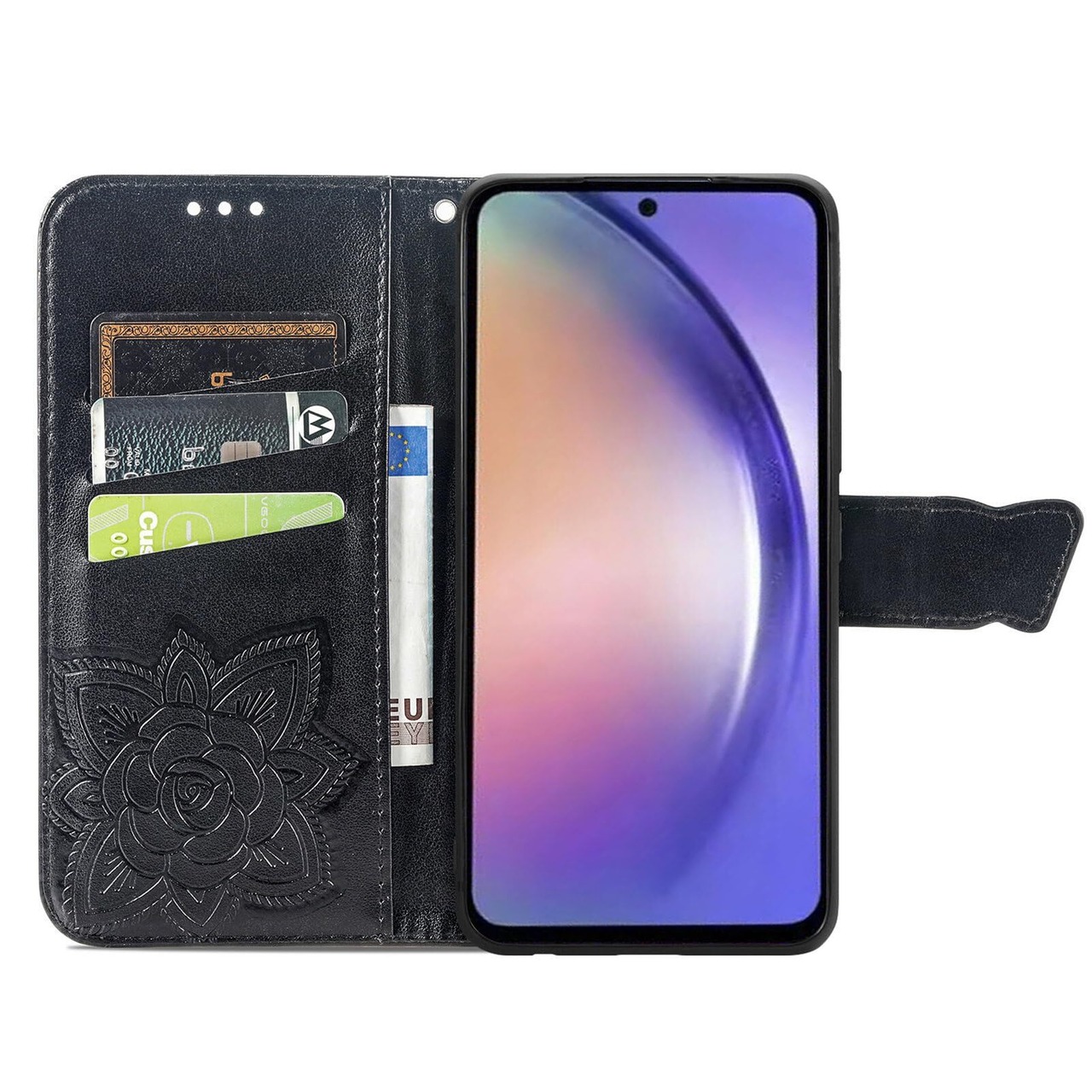 に適用するGalaxy A55 5G ケース 手帳型 ノートブック型携帯電話保護カバー多機能携帯電話ホルスター財布携帯電話ホルダーバンプパターンテクスチャ耐久性摩擦耐性携帯電話ケース男性と女性に適した多色オプション (バタフライ黒)