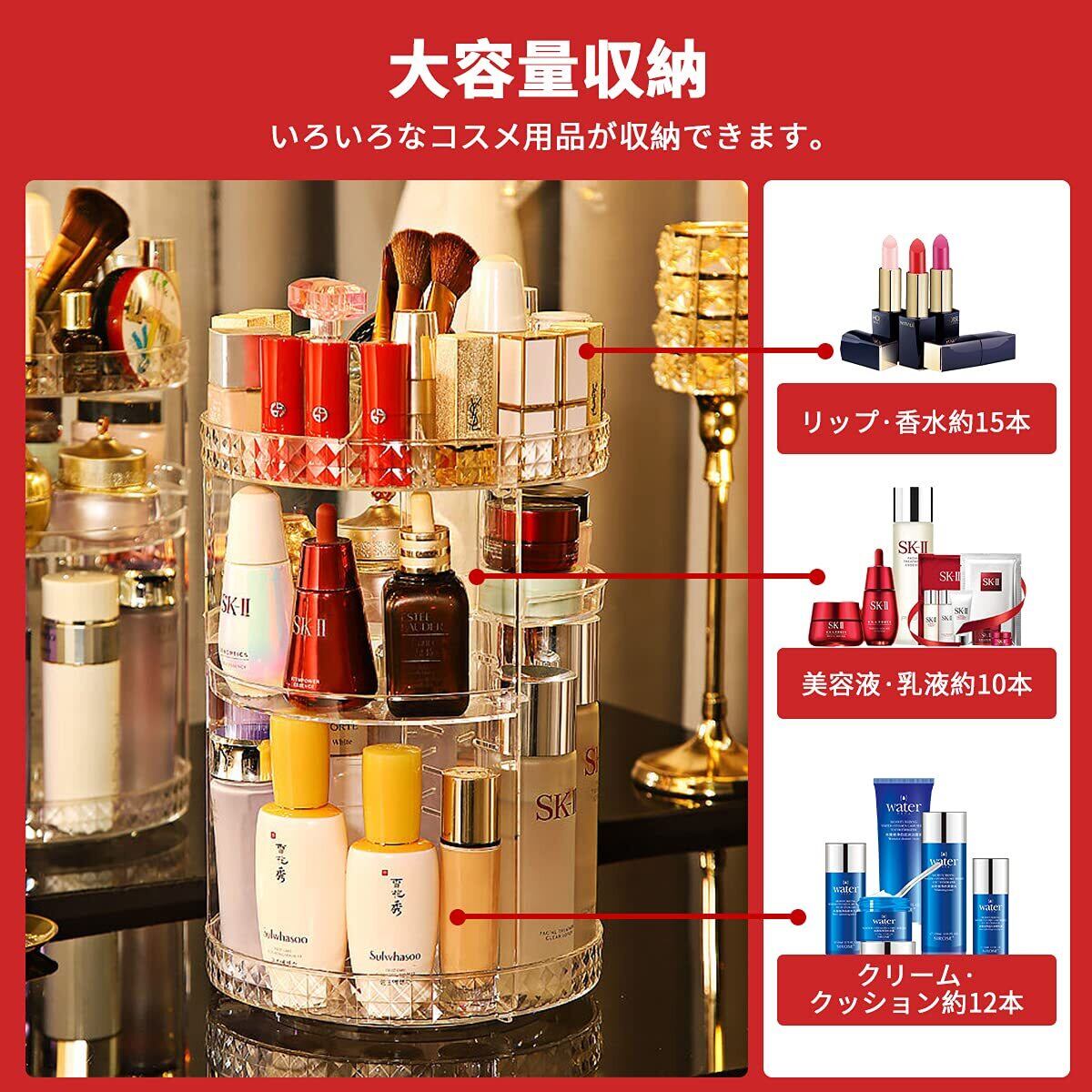 【360°回転】どの方向からでも使える高性能コスメボックス360度回転するしっかりした台で、コスメ用品がどこにあっても回転させるだけですぐに取り出せます。本製品は女性のための素敵な設計。あなたのコスメ用品を綺麗に整理し保管します。