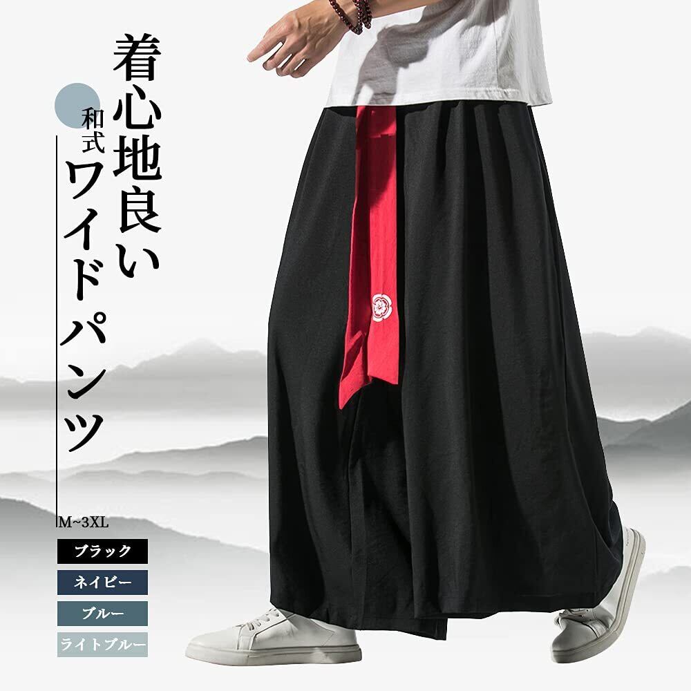 [KOGARASI] ワイドパンツ 袴パンツ メンズ ガチョウパンツ ゆったり ベルト付き 和柄 無地 麻 和式ズボン サルエル ビッグシルエット 黒 ブラック 衣装 大きいサイズ ルームウェア オールシーズン ゆるゆる 男女兼用