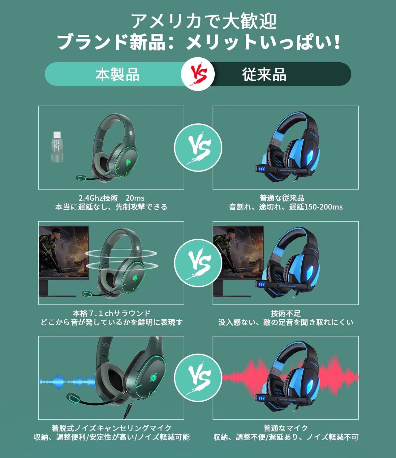 ゲーミングヘッドセット 有線/無線両用 低遅延 USB2.4GHz /Bluetooth 5.3/有線3WAY接続 ゲーミングヘッドホン 着脱式ノイズキャンセルマイク 45時間連続再生 重低音強化ヘッドセット pc ps5 ps4 スマホxboxone switch 対応ワイヤレスヘッドフォン 緑