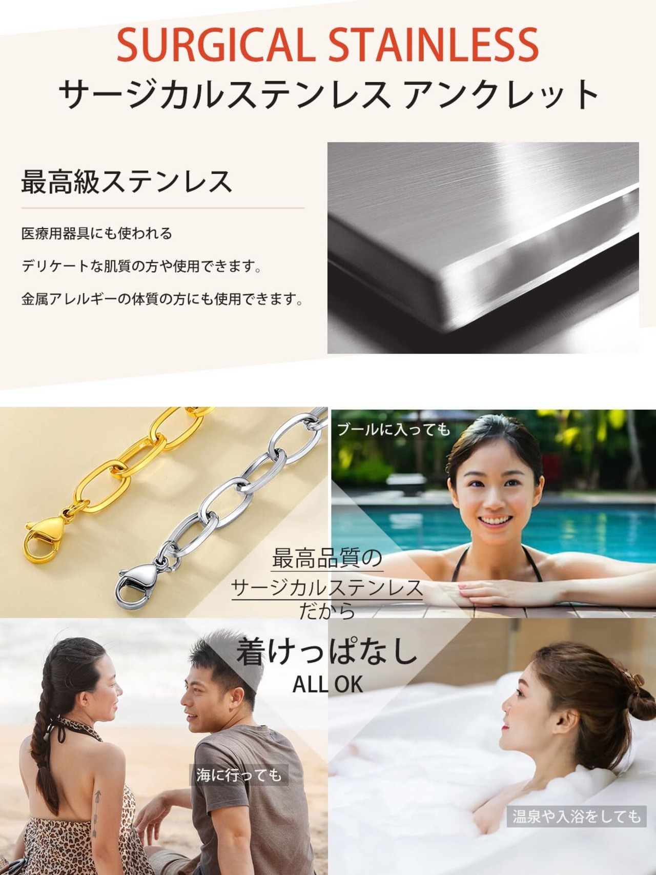 [ステンレスアンクレット]医療現場でも使用されることの多いステンレスは、耐食性に優れているためアレルギーの原因となる金属イオンが溶け出しにくい素材です。そのため、金属アレルギーの方も比較的安心してご使用いただけます。※注意:すべての方に金属アレルギー反応が出来ないこと(アレルギーフリー)を保証するものではございません。 皮膚に異常を感じた場合は直ちにご使用を中止し、専門医にご相談ください。