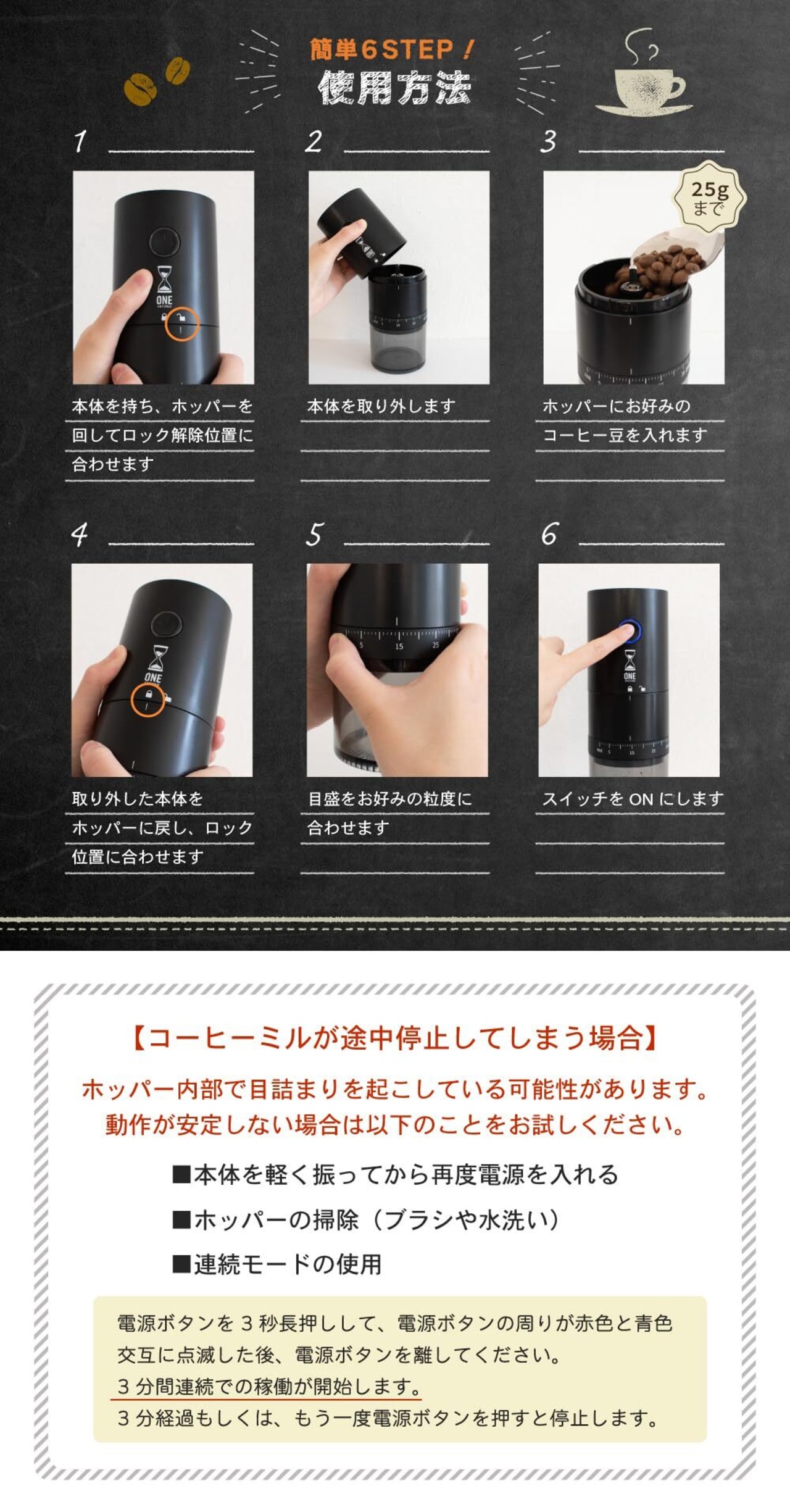 『動作が途中停止する場合』ホッパー内部で目詰まりの可能性があります。以下の方法をお試し下さい。【本体を軽く振って再稼働】【ホッパーの掃除(ブラシや水洗い)】【3分連続モードの使用】=電源ボタンを長押し〜赤色と青色の交互点滅後に離す。