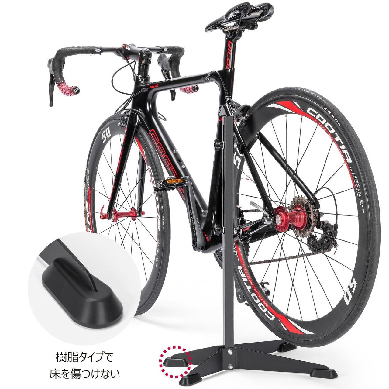 【ディスプレイスタンド】 自転車を軽く持ち上げ、フレームのリア三角(シートステーとチェーンステー)の2か所をフックにかけるだけで自転車を自立させます。
