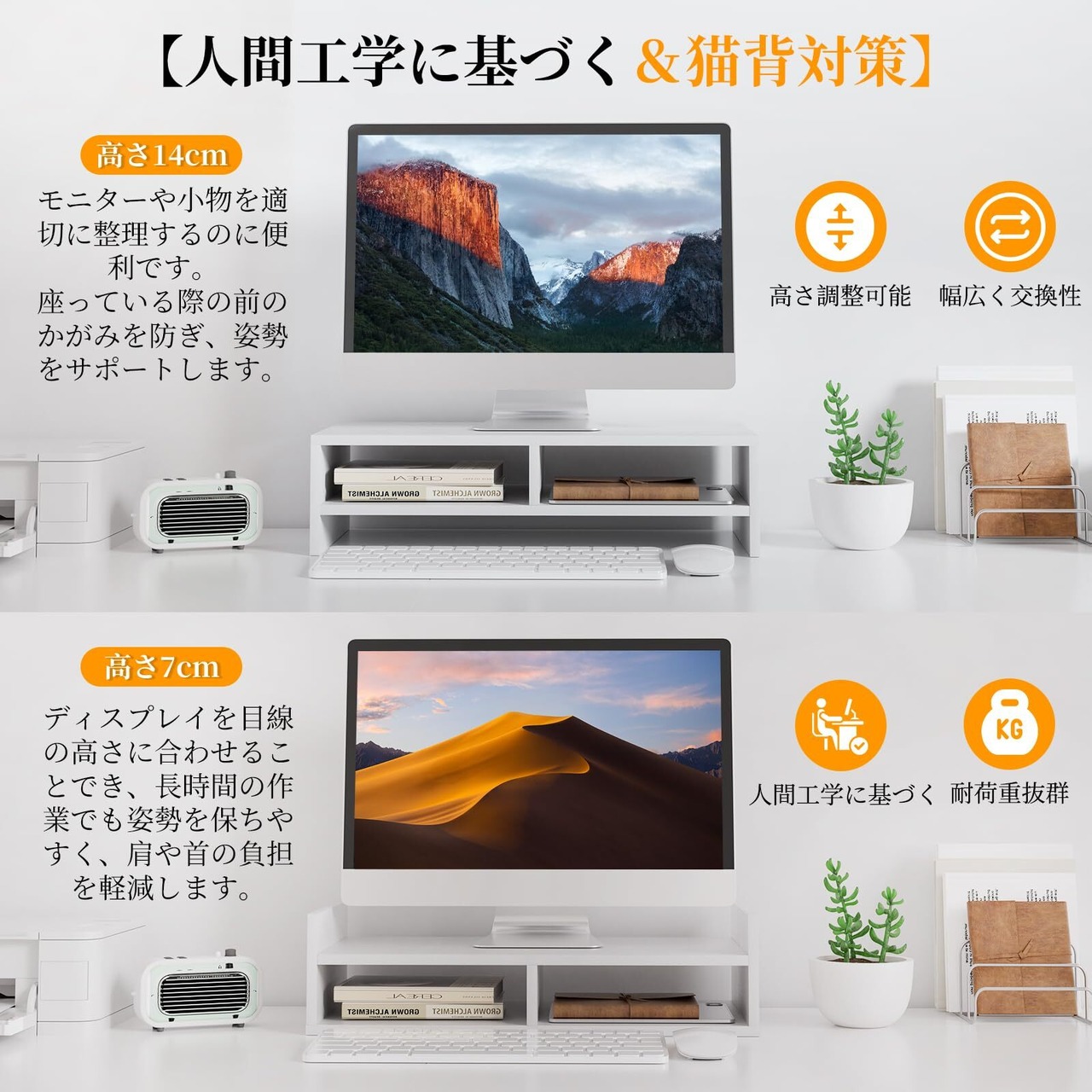 【人間工学に基づく&猫背対策】他のスタンドに比べて、構造もしっかりしていて良いモニタースタンドだ,優れたデザイン。一般的なモニターを置くことができます。モニターの高さは普通より10CMアップさせます!それにより、自然に目線の位置を上げて目の疲れや背中および頚椎の疲労を軽減でき、作業効率もUP! 健康な生活ができます!