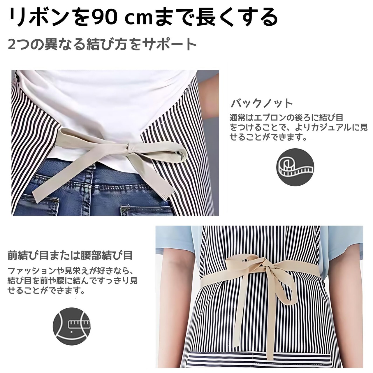【調整可能】首ひもはバックル式なので、身長に合わせて30 cmから48 cmの間で自由に調整できます。ベルトは十分な長さがあるので、前結びをすると腰がスッキリして見えるので、ゆったりと着たい人は後ろ結びがおすすめです。