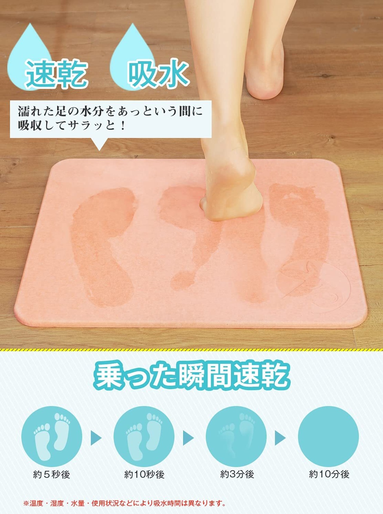 吸水性・速乾性がよい。驚きの超吸水力で、お風呂あがりびしょびしょの足元の水滴を瞬時吸い取ってくれる。吸い付くようにすぐ乾く、家族みんなの足元をさらさらに。