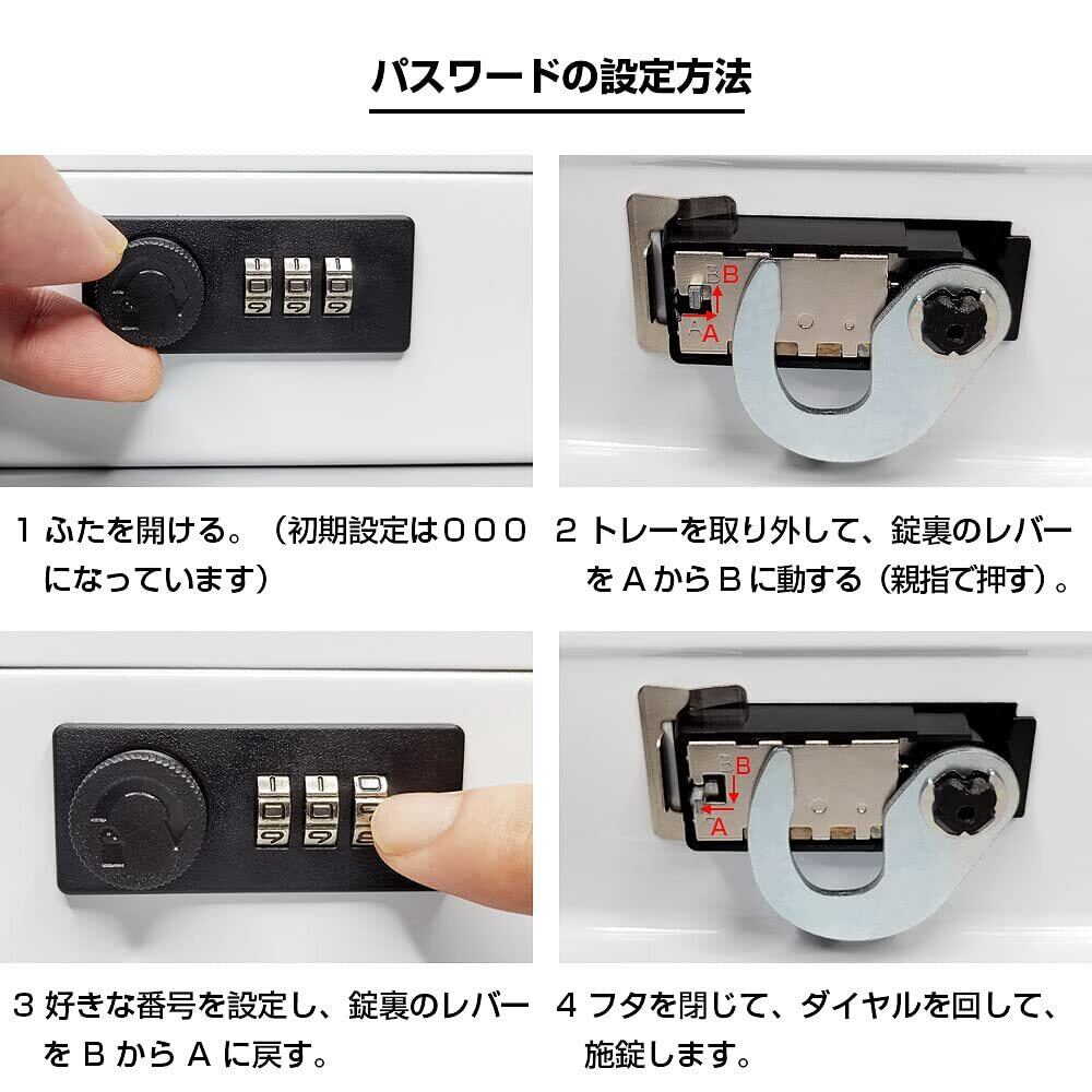 スチール収納ボックス。3桁ダイヤル式ロック。トレー付き。