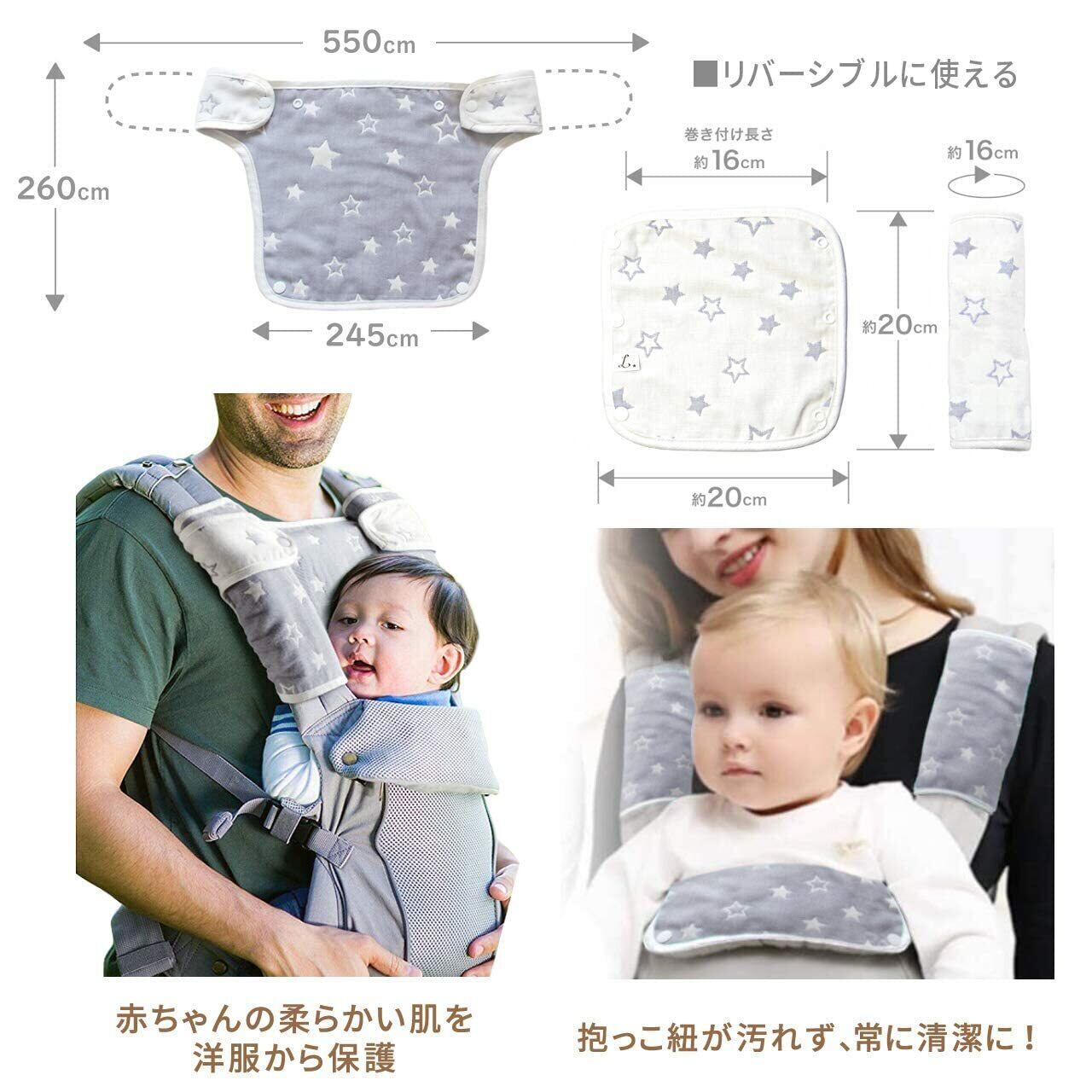 【しっかりと抱っこ紐を覆うサイズ️】抱っこ紐にカバーをつけているのに、カバーの長さが足りず、結局赤ちゃんの口が抱っこ紐本体に付いている経験はないでしょうか。抱っこ紐本体は洗濯機にかけられないことが多く、汚れてしまうと洗うのが大変!本品は、通常より大きめの20cm x 20cmの設計になっており、幅広く抱っこひもの紐部分を覆いますので、抱っこ紐が汚れることを防ぎます。また、胸当ても550×260x245mmの大きなサイズで抱っこ紐の前面やご両親の お洋服がよだれまみれになることを防ぎます。※サイズの確認は開発時点になりますので、お使いの抱っこ紐にサイズが合うか必ずご確認下さい。※洗濯は洗濯ネット利用推奨。乾燥機は生地が痛むため推奨しておりません。また、ガーゼという生地の特性上、洗濯により縮みますが、利用していく元のサイズに戻っていきます。