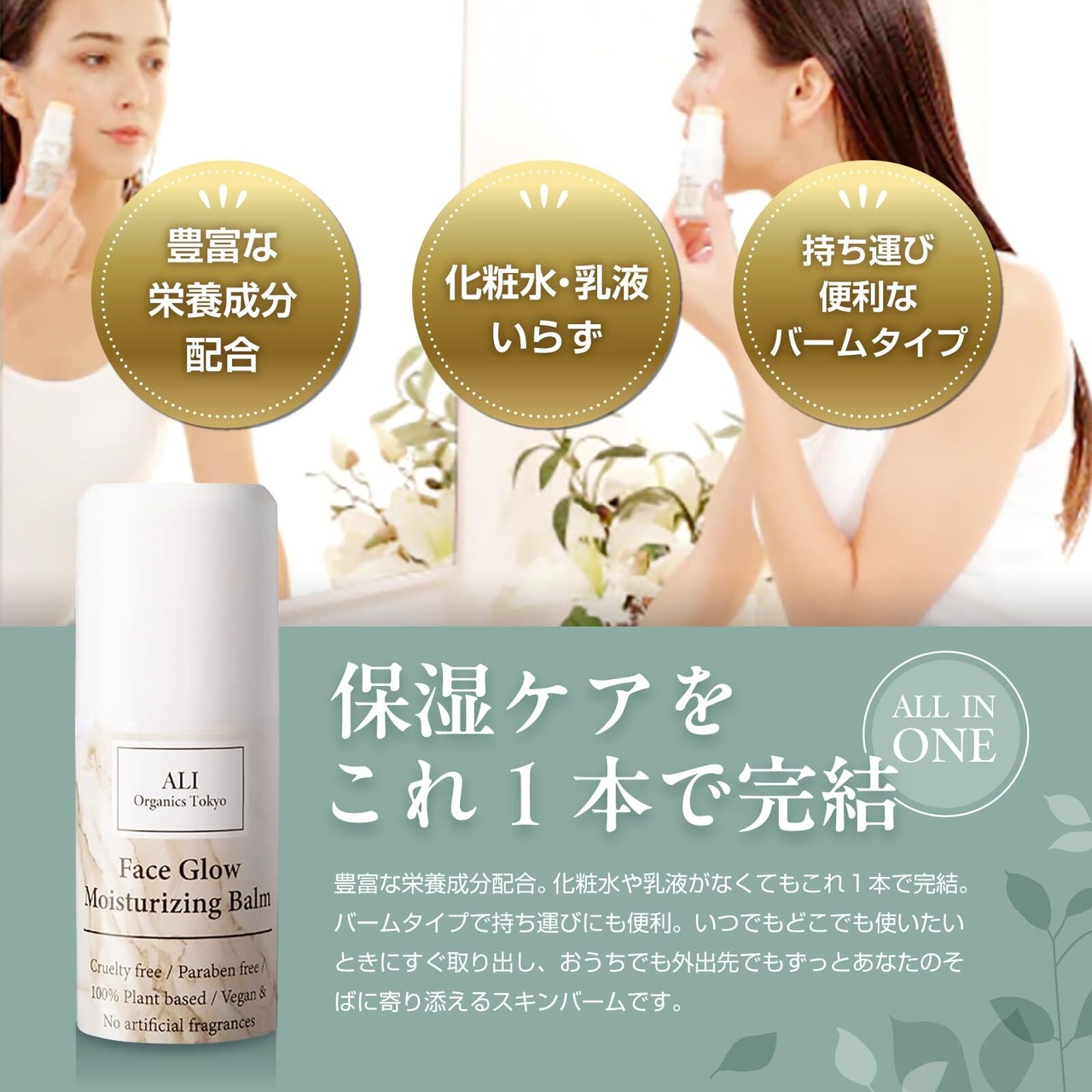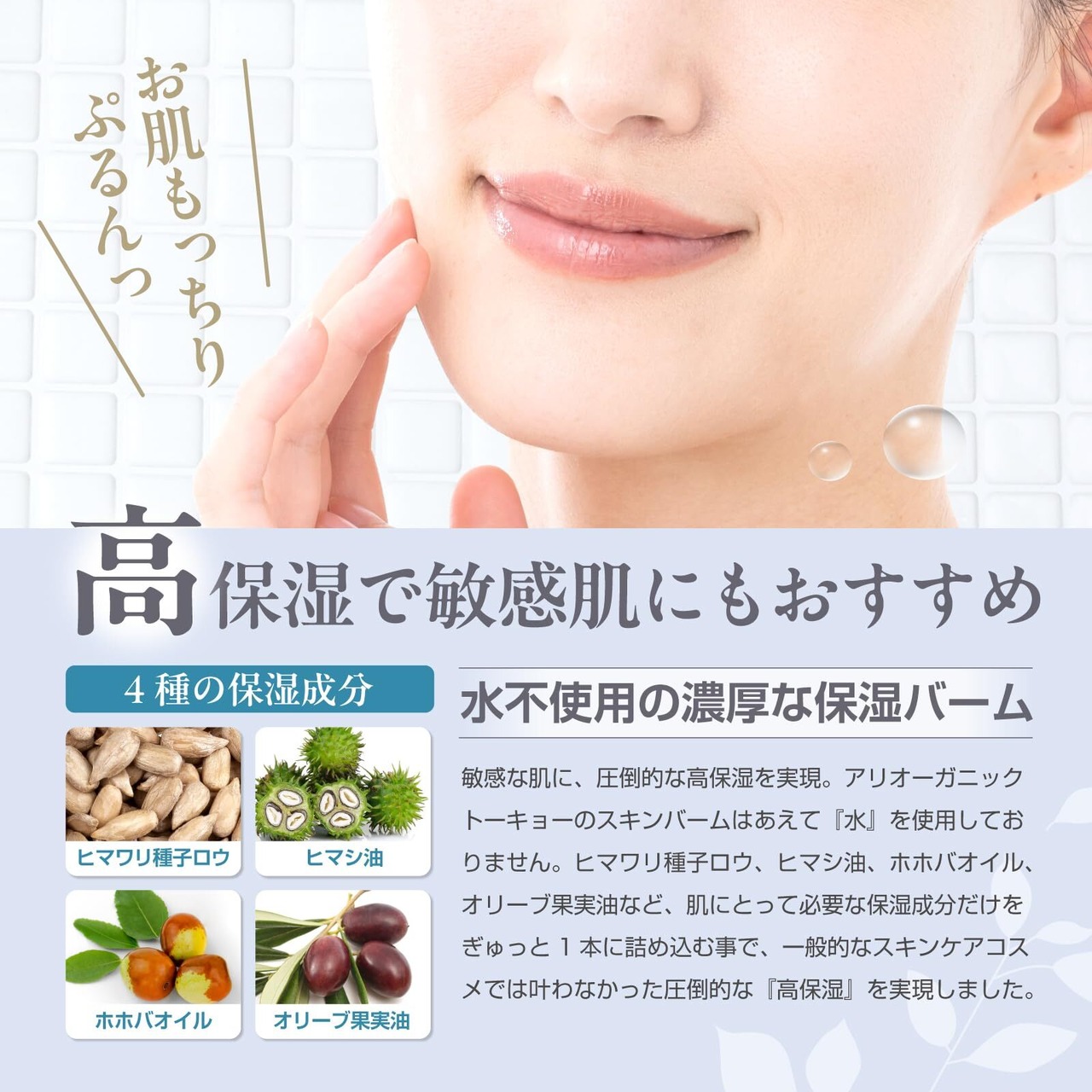 【高保湿で敏感肌にもおすすめ】敏感な肌に、圧倒的な高保湿を実現。アリオーガニックトーキョーのマルチバームはあえて『水』を使用しておりません。ヒマワリ種子ロウ、ヒマシ油、ホホバオイル、オリーブ果実油など、肌にとって必要な保湿成分だけをぎゅっと1本に詰め込む事で、一般的なスキンケアコスメでは叶わなかった圧倒的な『高保湿』を実現しました。