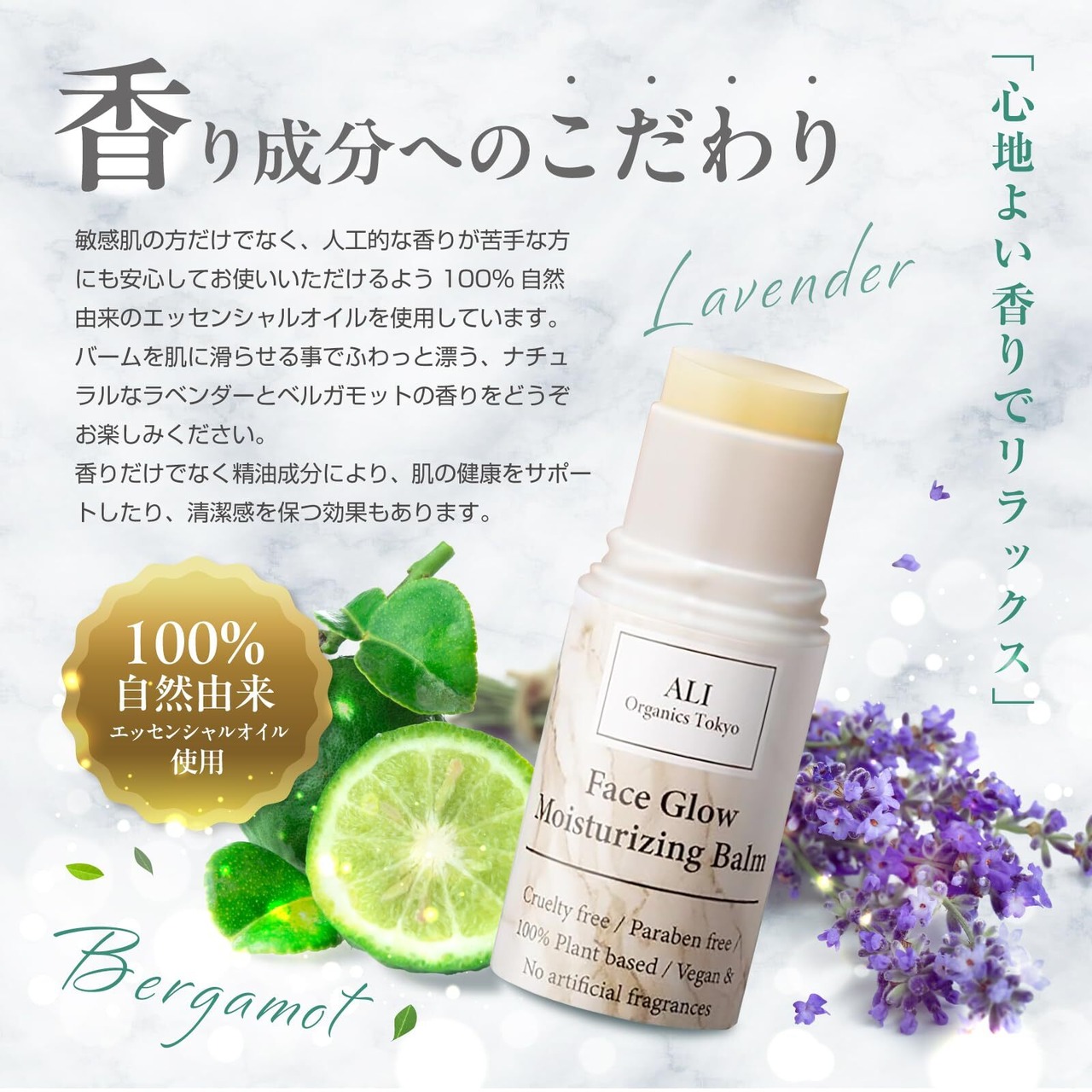 【 香り成分へのこだわり】敏感肌の方だけでなく、人工的な香りが苦手な方にも安心してお使いいただけるよう100%自然由来のエッセンシャルオイルを使用しています。バームを肌に滑らせる事でふわっと漂う、ナチュラルなラベンダーとベルガモットの香りをどうぞお楽しみください。香りだけでなく精油成分により、肌の健康をサポートしたり、清潔感を保つ効果もあります。