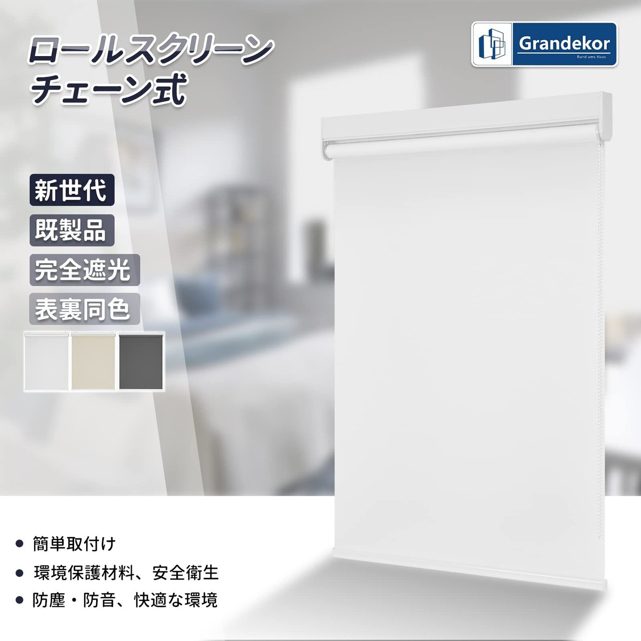 Grandekor ロールスクリーン 1級遮光 無地 ロールカーテン チェーン式 表裏同色 UVカット・防音・断熱 防寒 カーテンレール取付可能 (ベージュ 幅110x丈180CM)