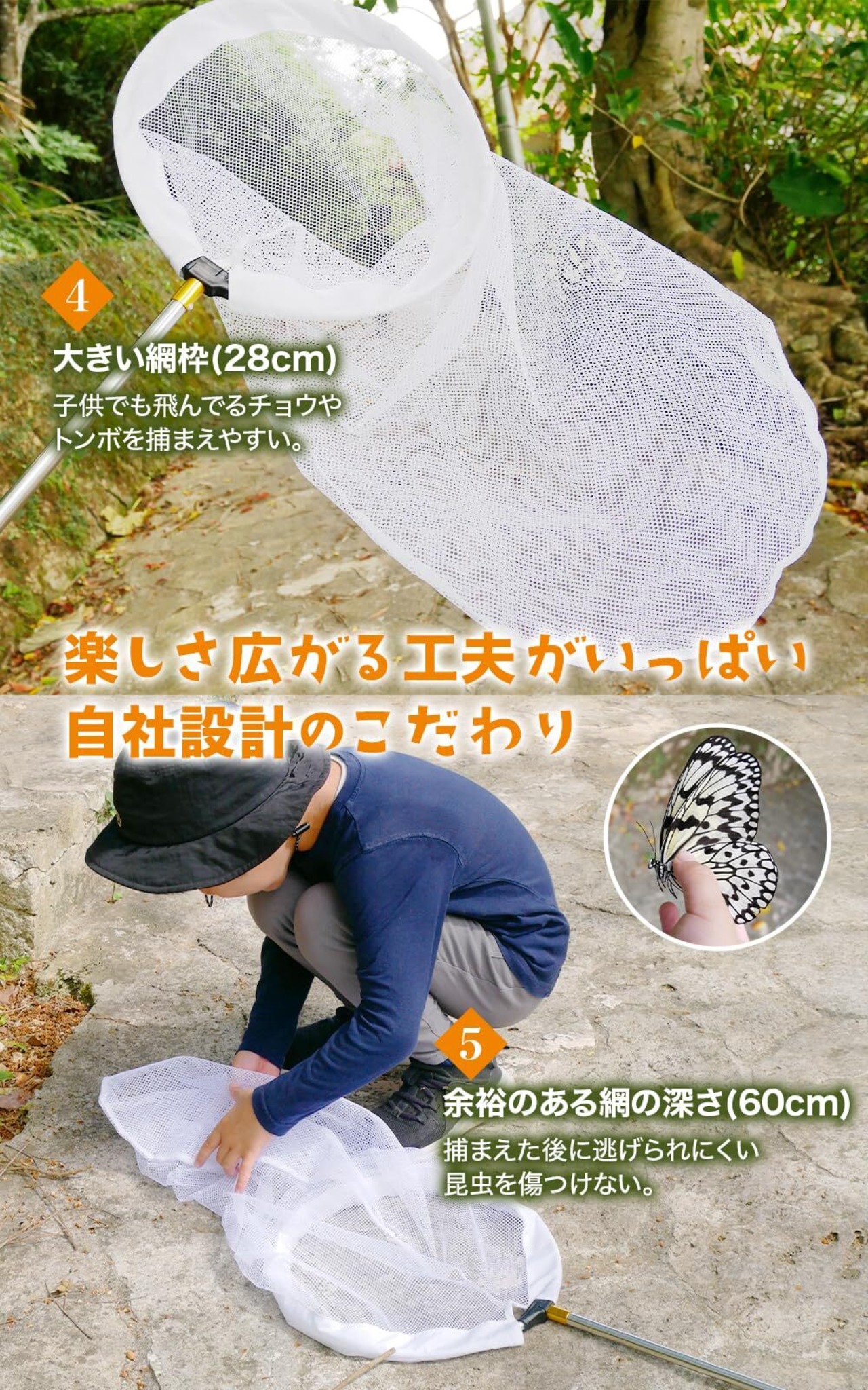 【子供専用の虫取り網】推奨年齢は6歳以上。こだわりの自社設計の虫取り網。超軽量の250gなので子供でも扱いやすい。お子さんがつい網を地面に叩きつけてしまっても網破れ防止保護カバー(素材:210dオックスフォード)で破れにくいため安心!素材は70gナイロンメッシュを使用し丈夫な生地を丁寧に裁縫。網目は1mmだから小さな虫を逃さない。網に十分な深さ(60cm)があるため、捕まえた後に逃げられにくく、昆虫が傷つきにくい。