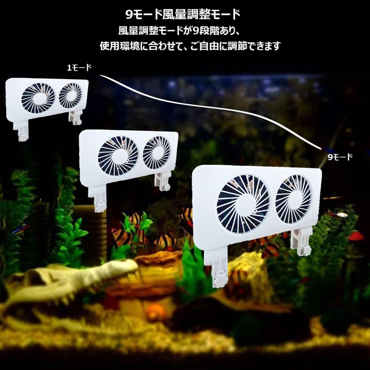 「9段階風量調節可能な水槽 冷却ファン」 水槽ファンは9段階風量調節できます、ご使用の環境温度に応じて調節できます。水温上昇防止に大活躍のす水槽用ファン、水面への強力送風で水温は2〜4℃下がることができます。