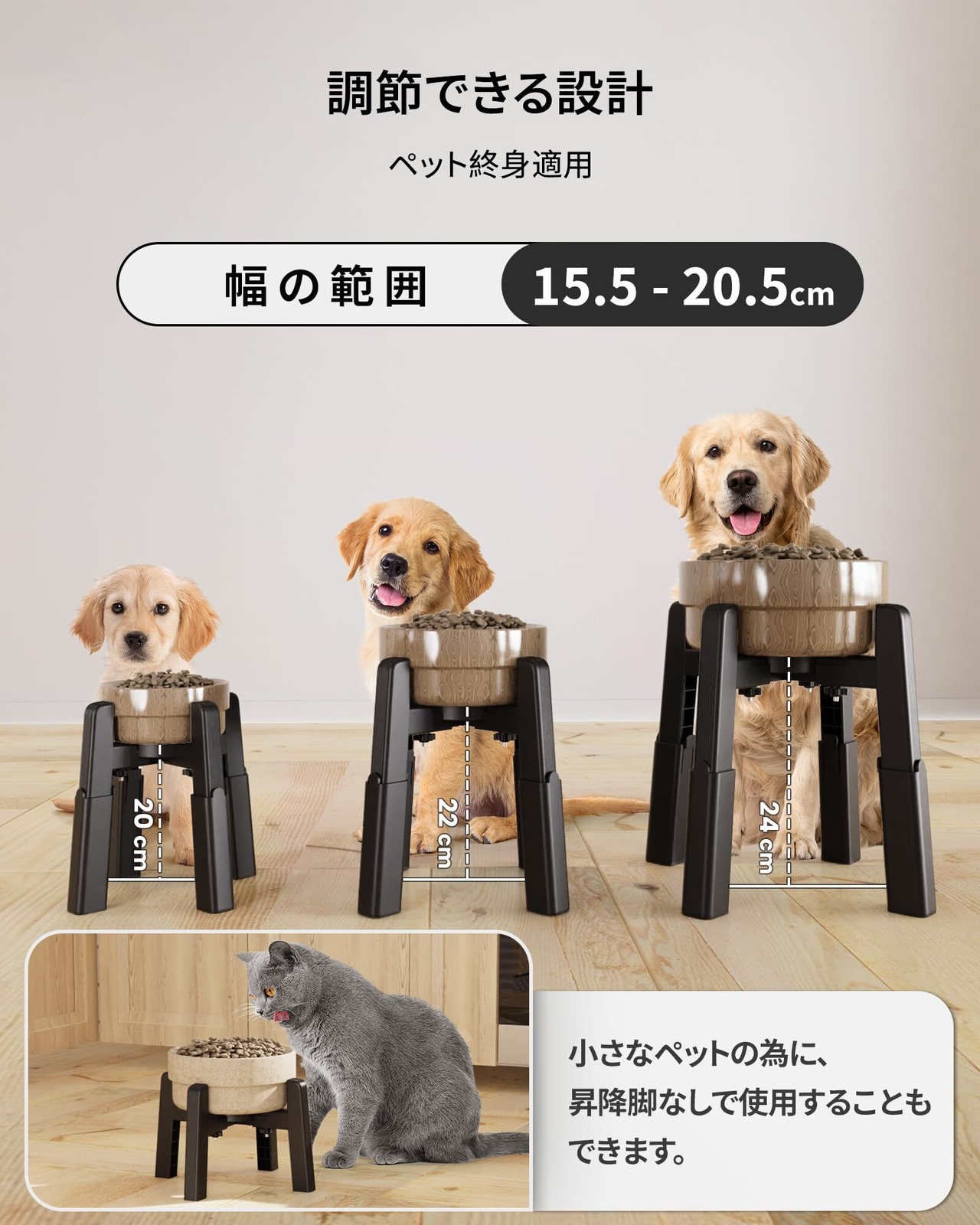【幅と高さが調節可能&終身適用】今市販しているスタンドのほとんどは、高さか幅しか調節できません。しかし、JUNSPOWフードボウルスタンドは、高さ13~24cm(脚付き)、幅15.5~20.5cmの調節が可能です。つまり、あらゆる形やサイズの犬食器に適しています。 また、簡単に調整できるように設計されています。 JUNSPOWのスタンド1つだけで、あなたの大切なペットの各成長段階に十分付き合えます。