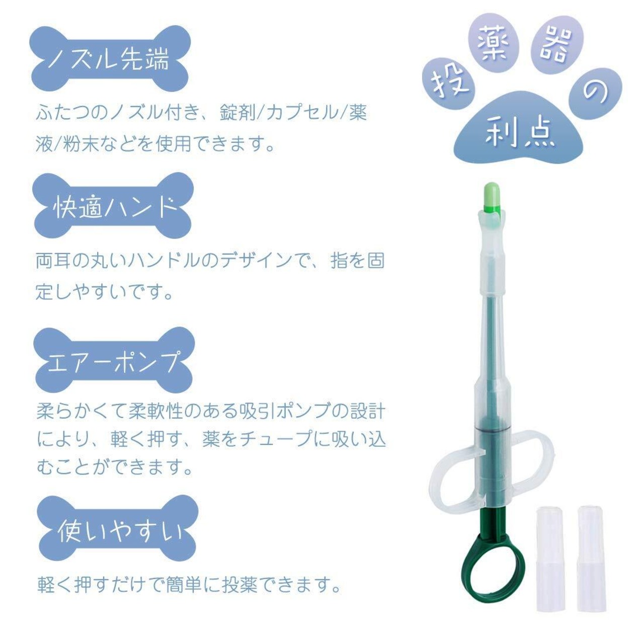 【ご注意】1. ノズルは、スリーブが挿入できなくなるまで、上部を完全にスリーブで固定する必要があります。2. 先端が喉に詰まるのを防ぐために、柔らかい先端をペットの喉の後ろに入れないでください。正しい使用法は、錠剤を喉の前に触れてから、プッシュロッドを使用して錠剤を押し出し、ペットに自分で錠剤を飲み込ませることです。