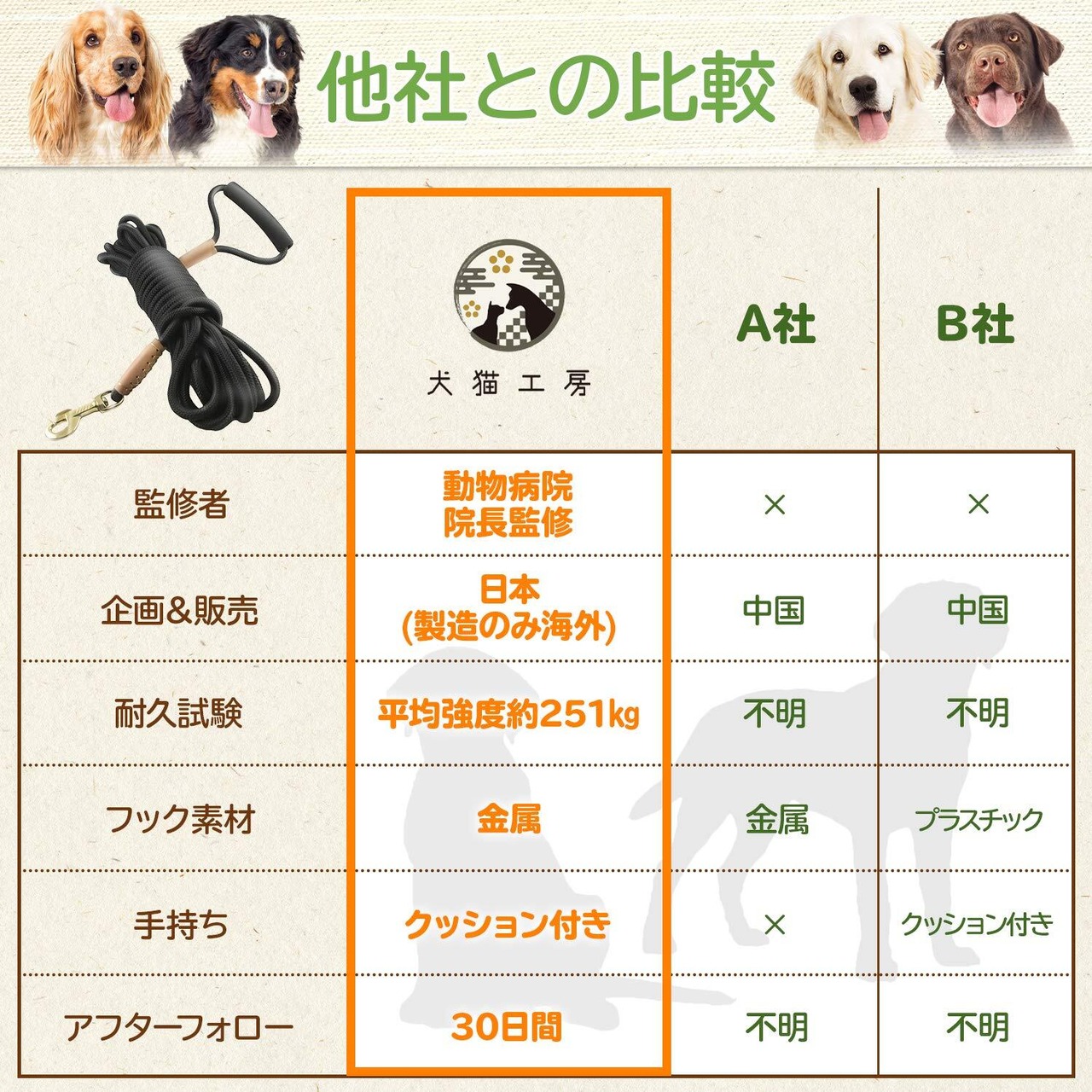 【 他社より高い 耐久力 がウリです 】 絡まりにくい 丸ロープ と丈夫な360°金属フックを使用。持ち手もクッション性が高く、手にやさしい仕様の ロングリード です。デザインにもこだわり、高級感あふれる外観です。リードを扱っている10社以上から提携工場を厳選。品質にこだわるhempyの基準を全て満たした工場に絞り、リード製造を行なっています。