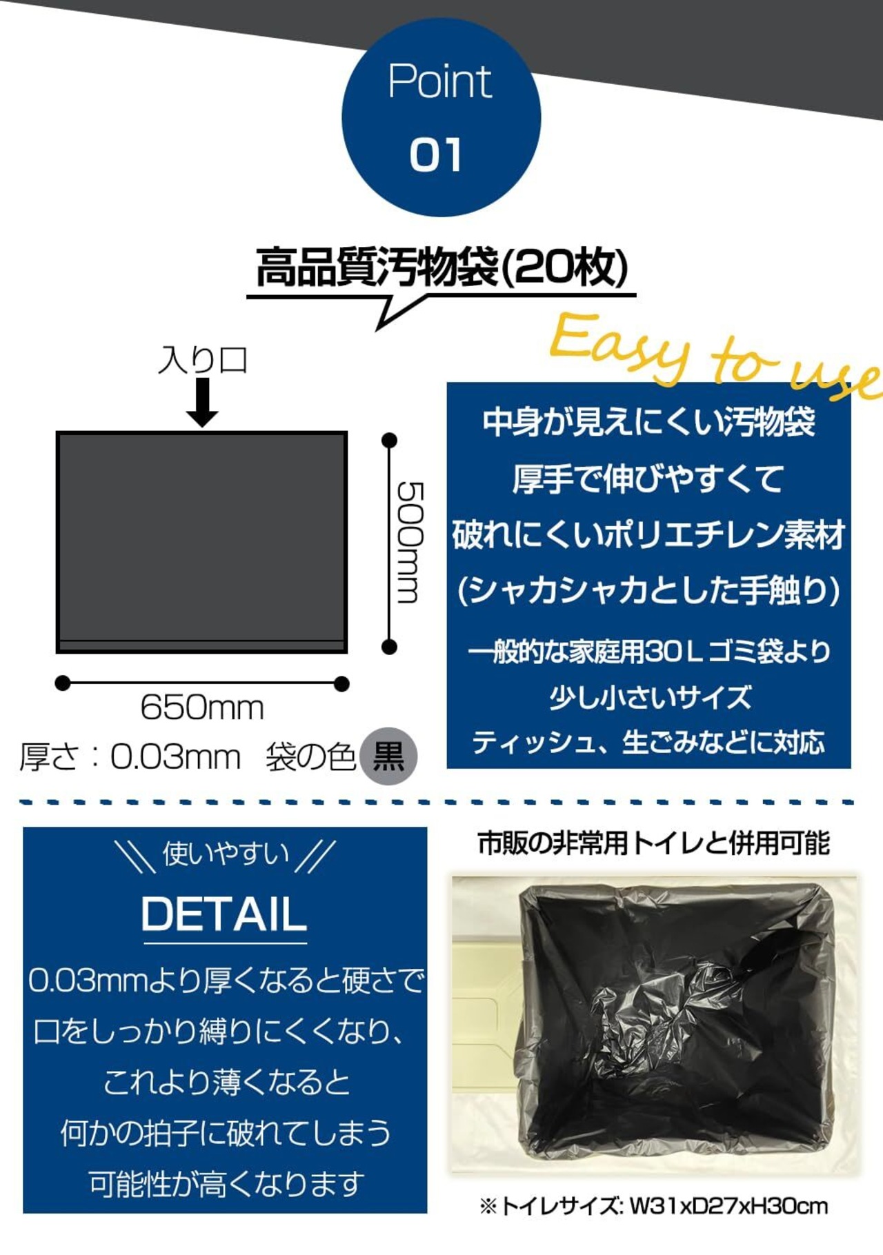 【各種ポータブルトイレに対応】汚物袋はLサイズ(650mmx500mm)を用意しました!幅広いサイズの簡易トイレ 、 ポータブルトイレに対応しております。もちろんご自宅の家庭用トイレでも兼用可能です。