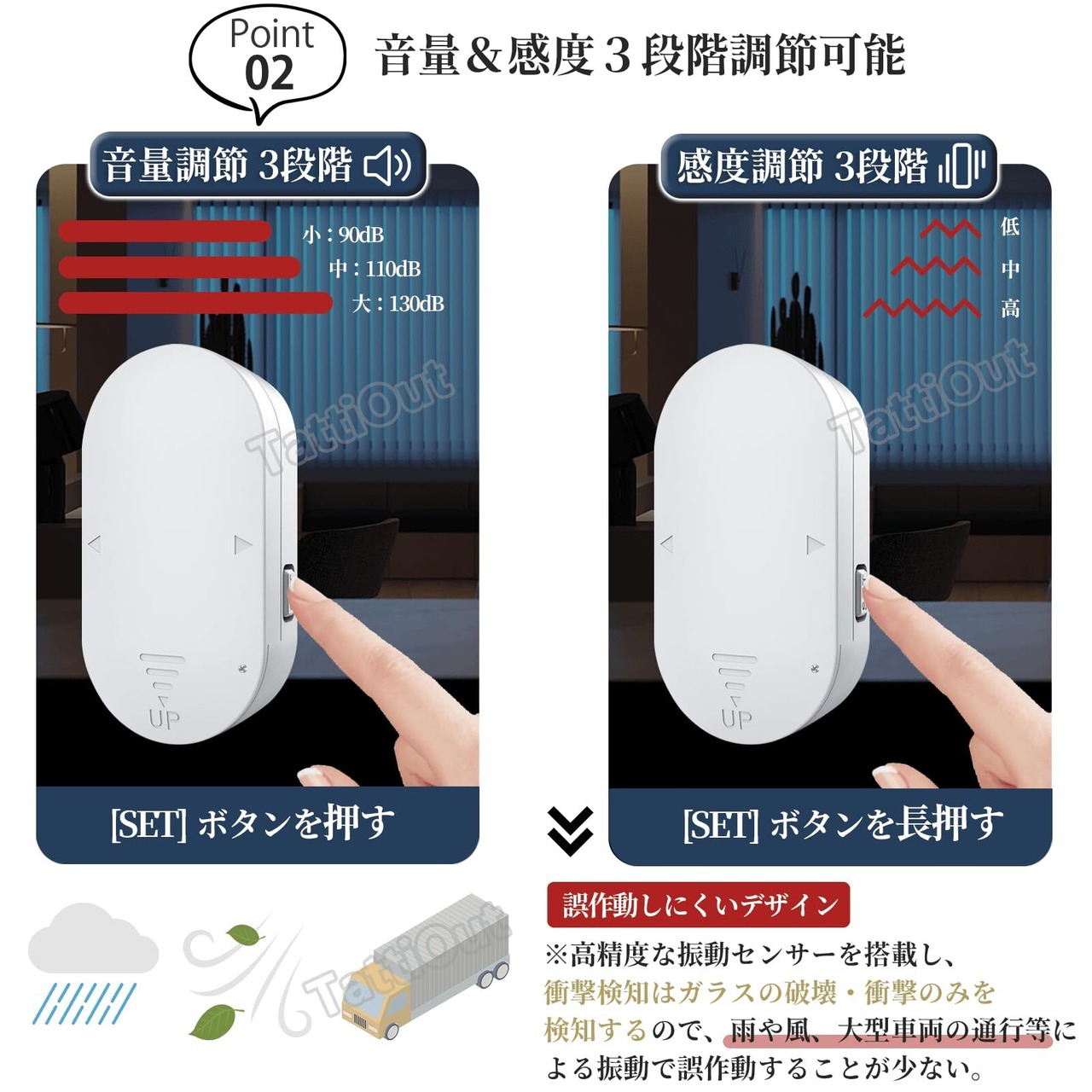 ■【音量調節 3段階】小90㏈・中110㏈・大130㏈。■【感度調節 3段階】低・中・高。高精度な振動センサーを搭載し、衝撃検知はガラスの破壊・衝撃のみを検知するので、雨や風、大型車両の通行等による振動で誤作動することが少ない。