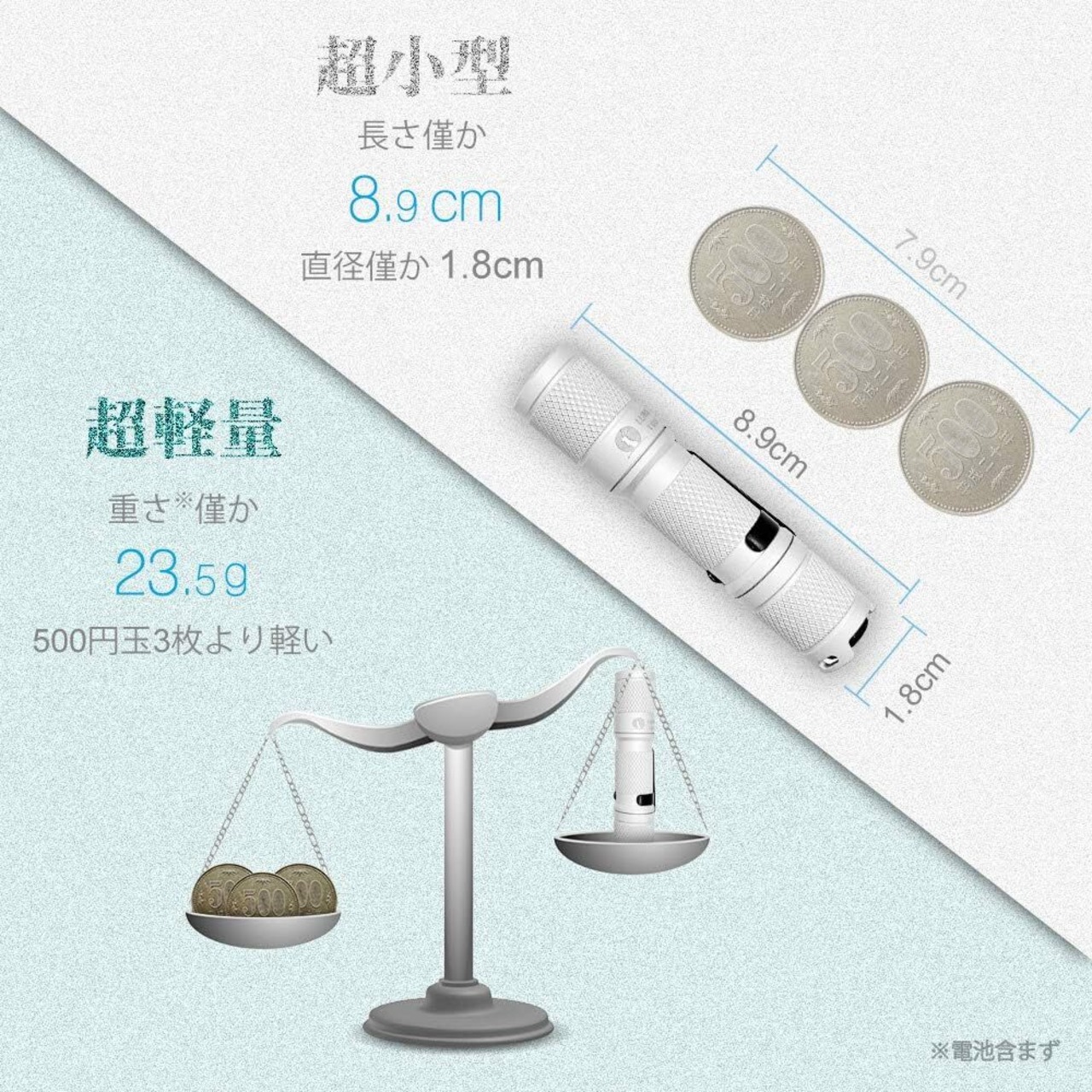 【超小型超軽量・五段階調光】航空機用アルミニウム合金を用いられた本体は、手のひらに収まれる8.9cm*1.85cmというコンパクトサイズになります。僅か23グラムの重量(電池含まず)では、500円玉3枚よりも軽く、片手で簡単に操作でき、携帯時にご負担になりません。5段階のライトモード(ターボ /高/中/ 低/ストロボ )機能を搭載しています。点灯モードはモードメモリ機能を搭載、常に使用する明るさから点灯できます。夜釣り・山登り・夜道の一人歩き・防犯・護身用・緊急災害時など様々なシーンに心強い味方です。