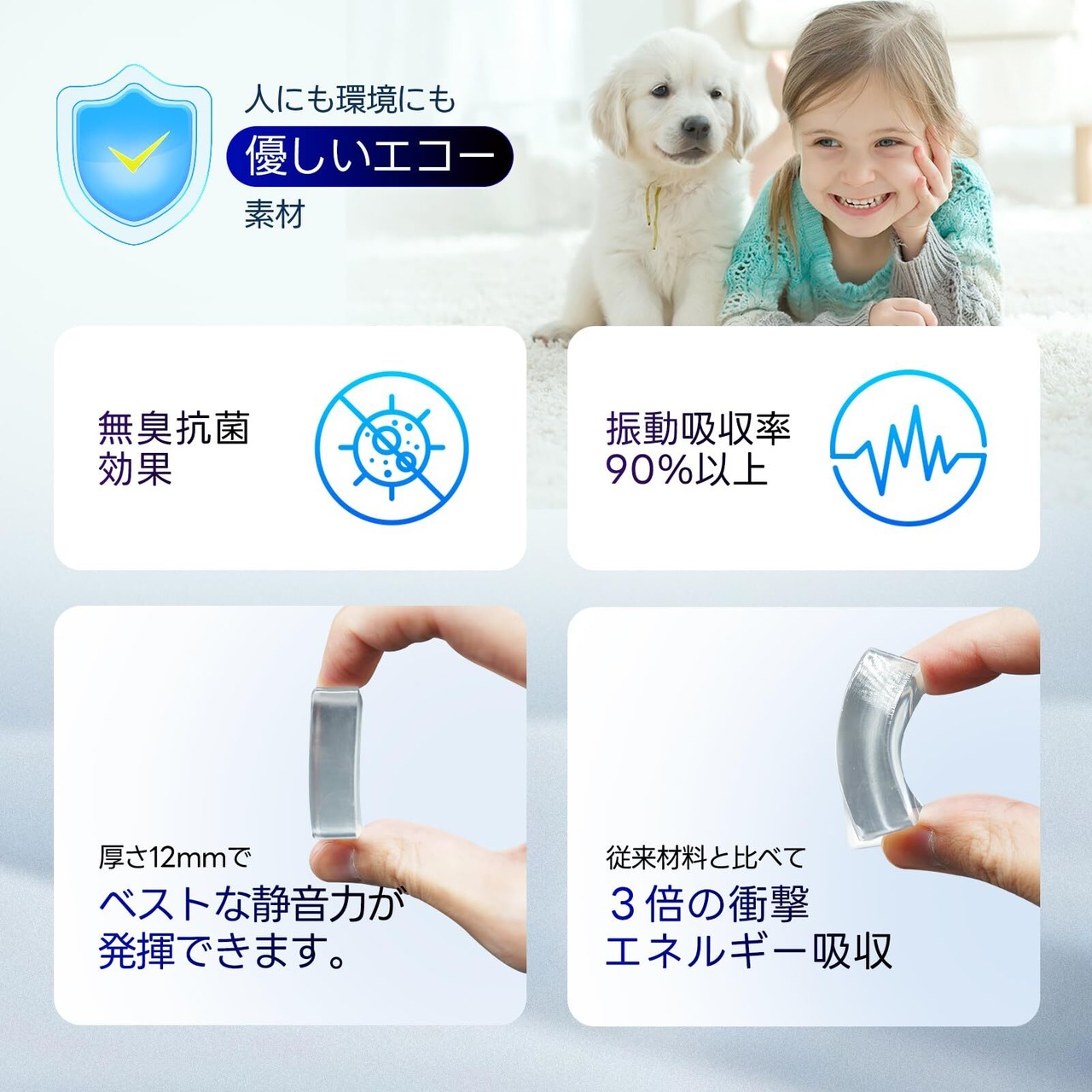 【静音マット・プレミアム】気になる騒音を効果的にカット、4枚の設置で耐荷重120kg以上(一枚あたり30kg)耐荷重トップレベル。インテリアを邪魔しないクリアタイプ。