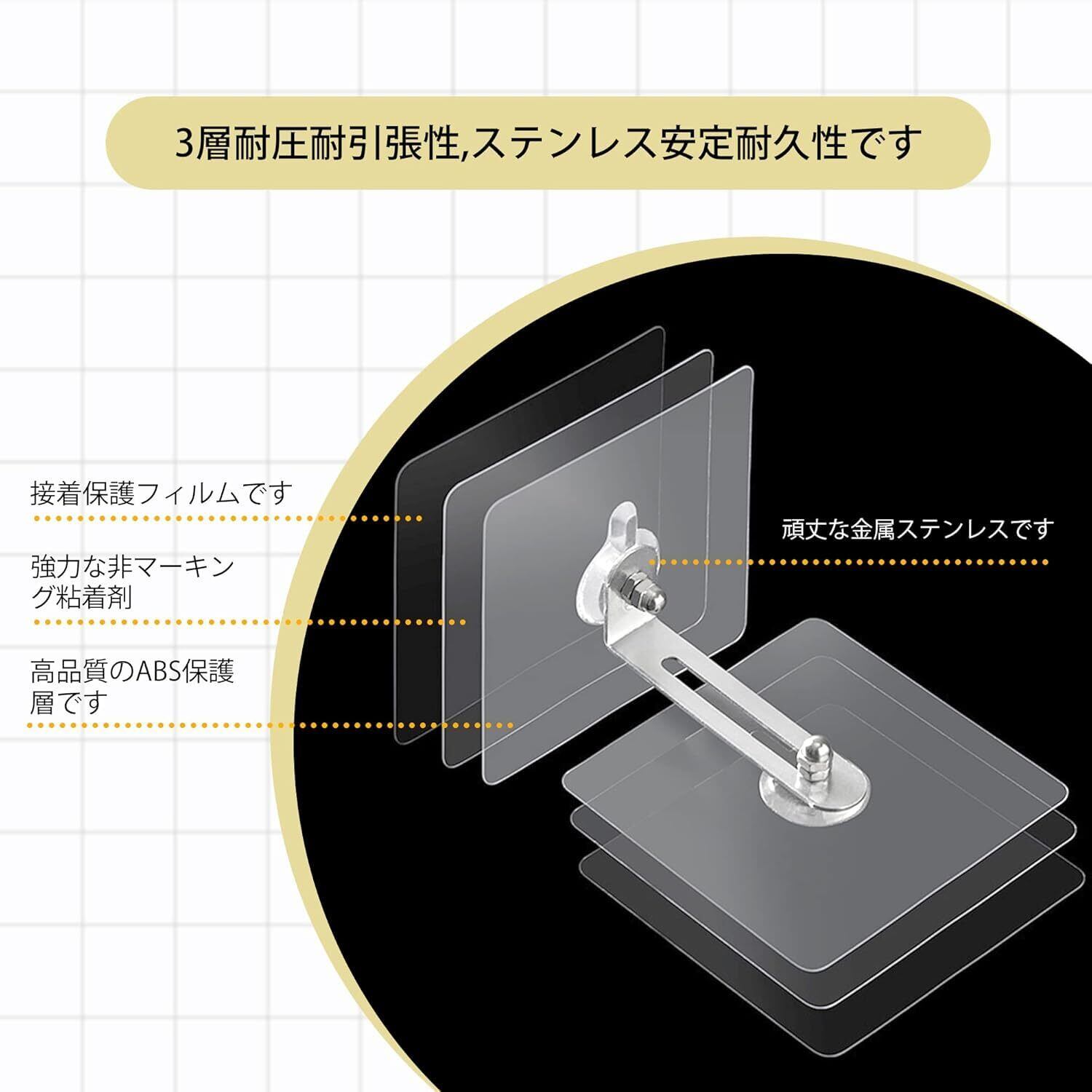 適用範囲:天然石板、陶磁器壁、人工石板、ガラス壁、人工プラスチック板、木壁などの多種の滑らかで硬質な表面に適用し、机、戸棚、本棚、冷蔵庫などの家具の転倒防止に使用でき、各種の環境シーンに応用できる(コンクリートなどの粗面や凹凸の大きい面には使用できません)