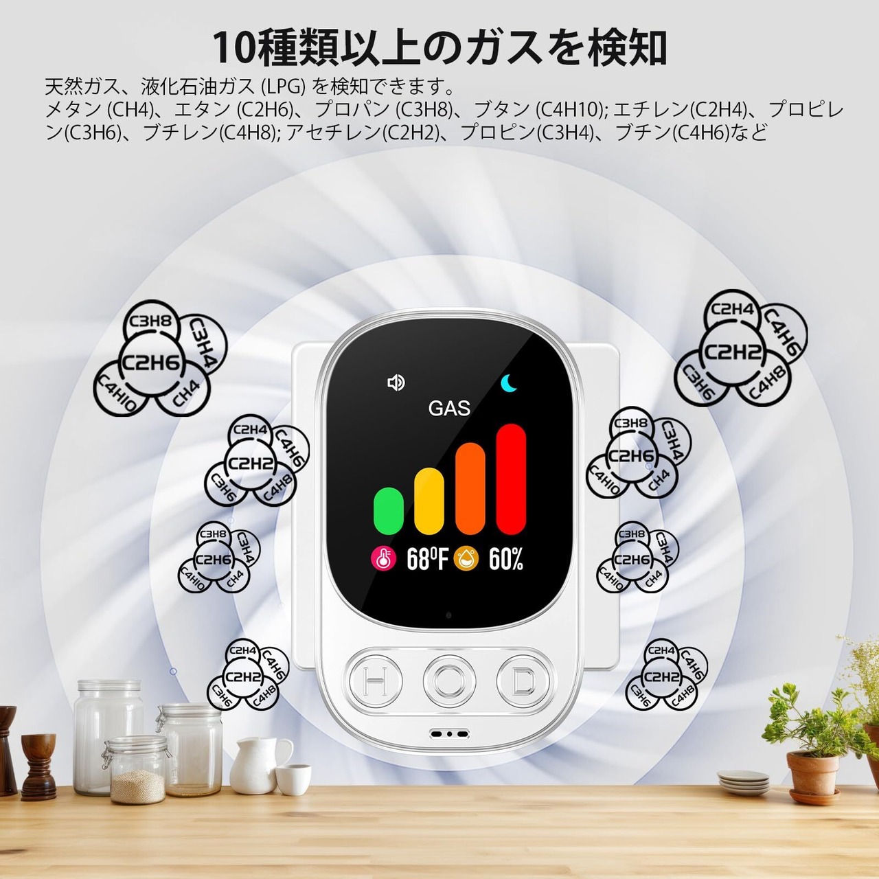 なぜガス検知器と温湿度を組み合わせるのですか? :キッチンや部屋の中央に設置すると、ガスの変化と家庭内の温湿度の変化を同時に監視できます。 キッチンの上や下に設置すると温度や湿度が見えにくくなります。 省エネモードをご利用いただけます。 省エネモードがオンになると、画面はオフになりますが、画面は緑色のインジケータライトが点滅し続け、動作していることを示します。 危険なガスを検知すると、赤色の表示灯が点滅し、2~5秒以内に警報音が鳴ります。 同時に画面も点灯してお知らせします。