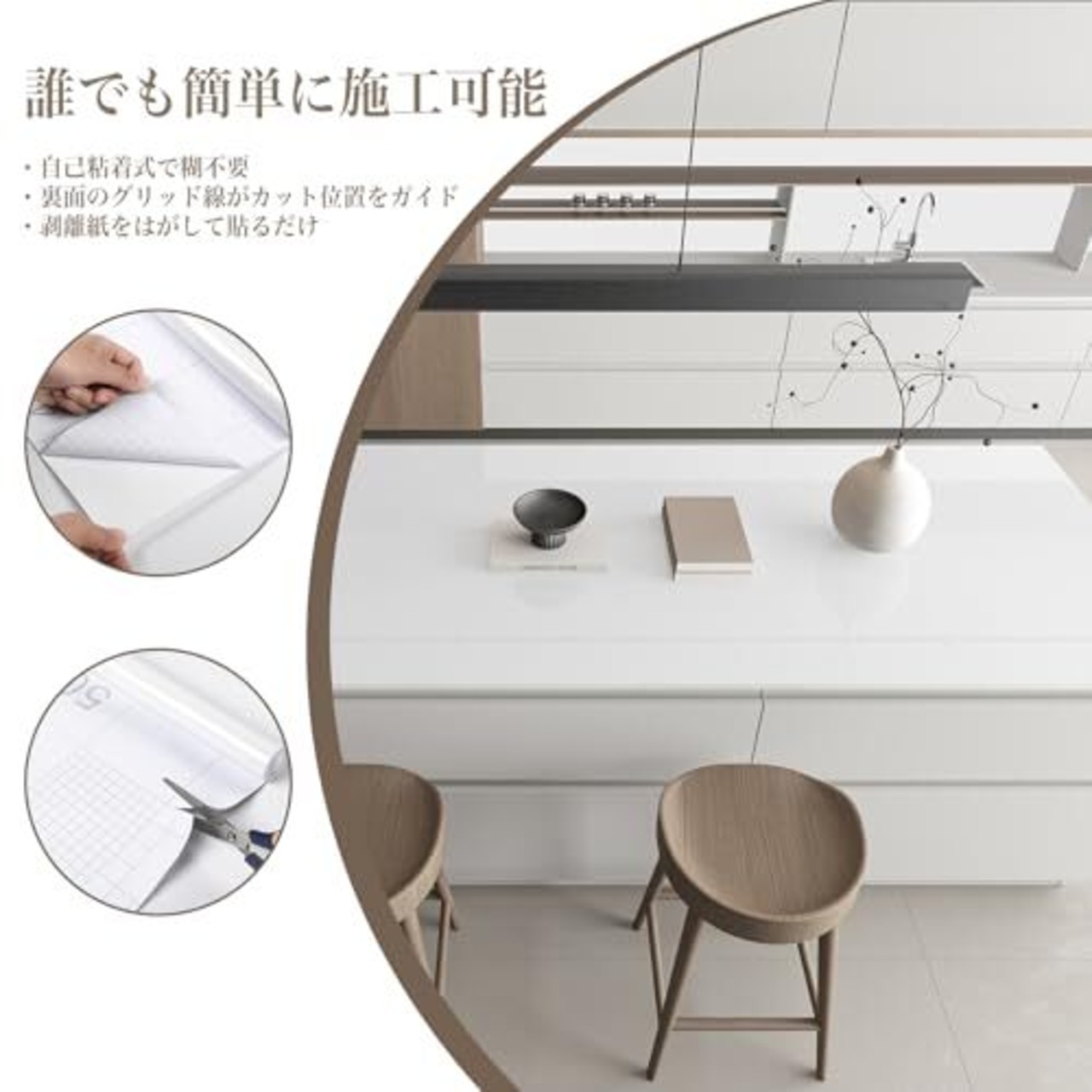 簡単な施工:1.接着剤不要の自己粘着タイプで、すぐに貼り付け可能です。 2.裏面には測定・切断用のグリッド線(方眼)付きで、正確なカットが簡単にできます。ご需要に応じて剥がしてから貼るだけでOK!簡単に模様替えができ、高級感と清潔感が溢れています。初心者でも簡単に使えます。3.剥がしても跡が残らないので、賃貸住宅でも安心してお使いいただけます