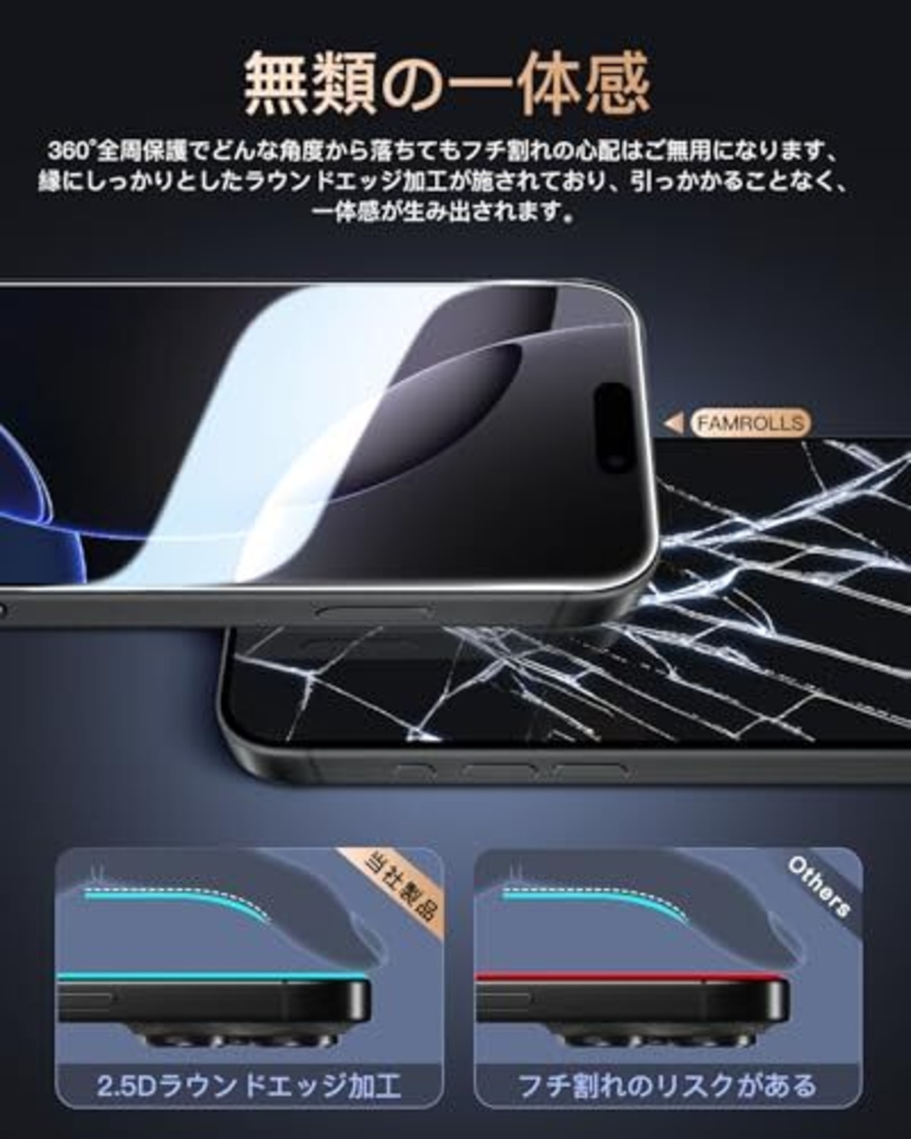 【対応機種】 iPhone 16 Pro 専用に設計されています。素材に日本製の旭硝子を採用。【年間30万販売パフォーマンス】:FAMROLLSの保護フィルムは30万枚の販売パフォーマンスに達成しました。【メーカー正規品】:実店舗を持つFAMROLLSブランドの保護フィルムは市販上の安価品、不良品とは異なり、高価なフィルムと変わらない高品質な保護フィルムを作り出すメーカーです。