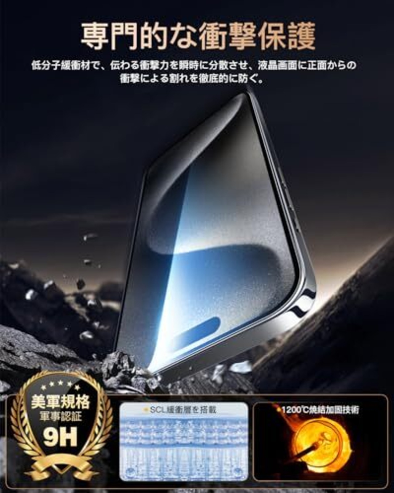 【9H硬度 飛散防止】スマホフィルムとレンズ保護フィルムはすべて旭硝子で作られており、スマホ保護フィルムの中で高レベルの9H硬度に達しています。手にフィットして持ちやすく滑りにくいので落ちにくいです。万が一落ちてもフィルムが衝撃を吸収してくれるので、スクリーンの損傷を低限まで抑えられます。また、特殊な飛散防止設計により、ガラスが割れても飛散しないため。
