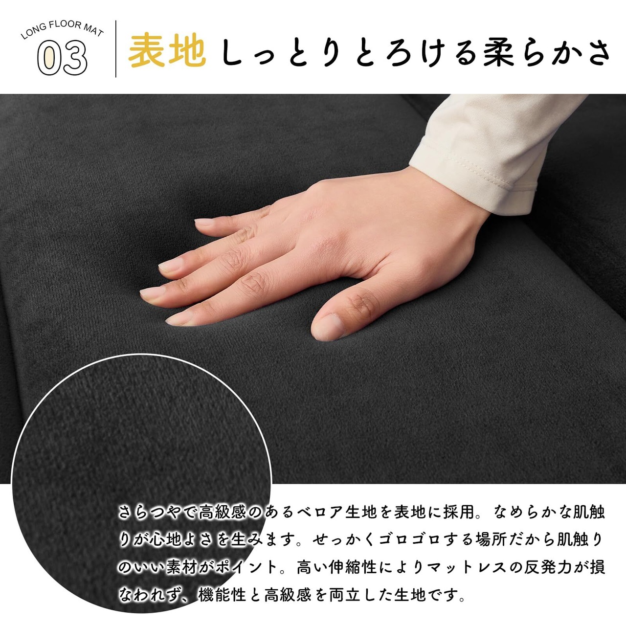 【肌触りなめらかベロア生地】 さらつやで高級感のあるベロア生地を表地に採用。なめらかな肌触りが心地よさを生みます。せっかくゴロゴロする場所だから肌触りのいい素材がポイント。高い伸縮性によりマットレスの反発力が損なわれず、機能性と高級感を両立した生地です。