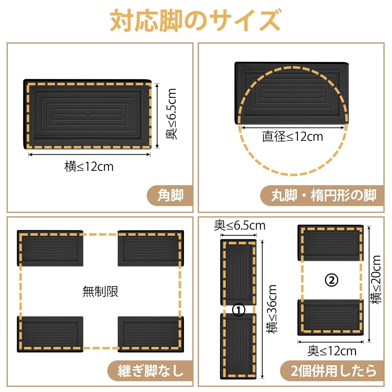 【必要に応じて高さを調節する】脚を置く天面のサイズ(11.6×6.1cm)がほとんどの家電製品と家具の脚に合っています。また、2個または4個を併用したら、大きめサイズの足にも対応しています。例えば、お子様の成長に合せて机の高さを調整できます。コタツ足の継ぎ脚として、寝転がっても腰が当たらず楽々です。仕事中、正しい座る姿勢を維持するために、オフィスデスク・椅子の高さを調節したいです。ベッド・ソファーを上げたら収納スペースを拡大することもできます。