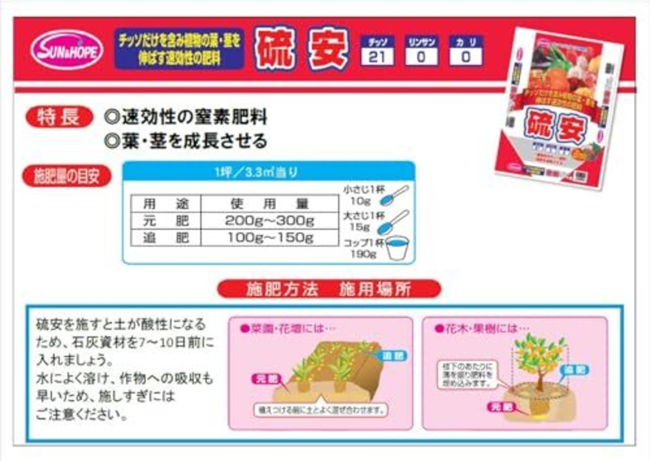 サンアンドホープ 専用肥料 硫安 5kg チッ素だけを含む 葉肥 植物の根・茎を伸ばす速効性肥料 約20坪分 水に溶けやすく土壌に吸着されやすい