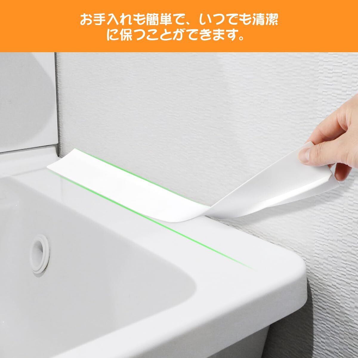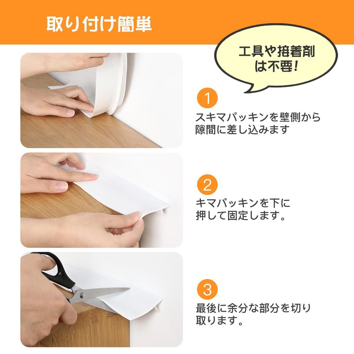 【取り付け簡単】具や接着剤は不要で、壁側からゆっくりと隙間にスキマパッキンを入れ、押さえて固定し、最後に余分な部分を切り取ります。取り外し可能なので、お手入れも簡単で、いつでも清潔に保つことができます。