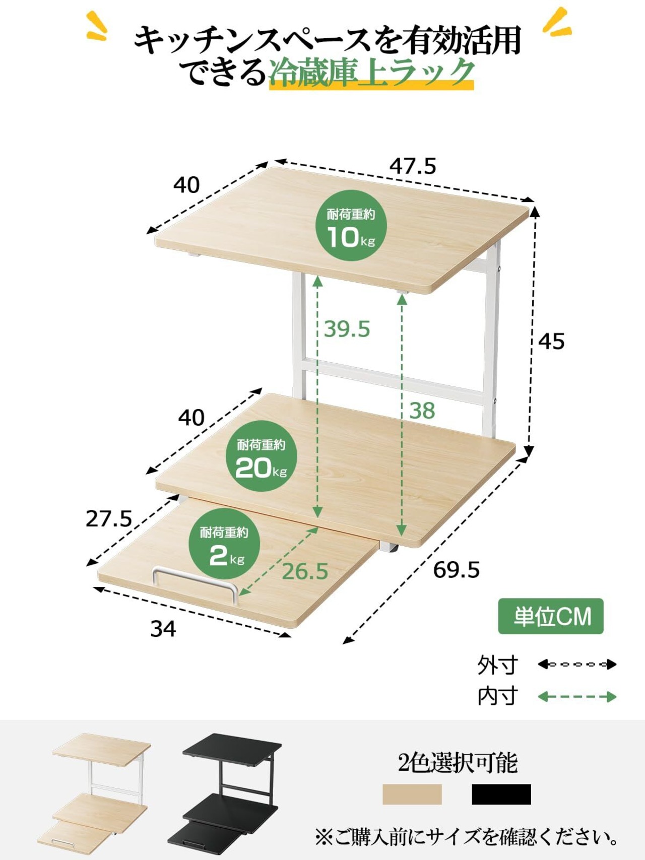 【冷蔵庫上ラック仕様】■サイズ 約幅47.5×奥行43.5~69.5×高さ45cm ■商品重量5.3Kg ■耐荷重 上棚約10Kg、下棚約20Kg、スライドトレー約2Kg ■ブラック/ナチュラル2色展開 冷蔵庫上をかしこく有効活用することで、無駄のないすっきりしたキッチンに。場所を取らずに収納スペースを確保できる。冷蔵庫周りがすっきり!ワンルームにお住まいの方や「キッチンの収納スペースが足りない!」と感じている方におすすめ。