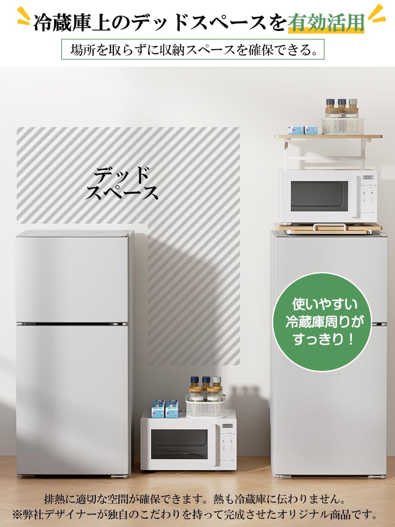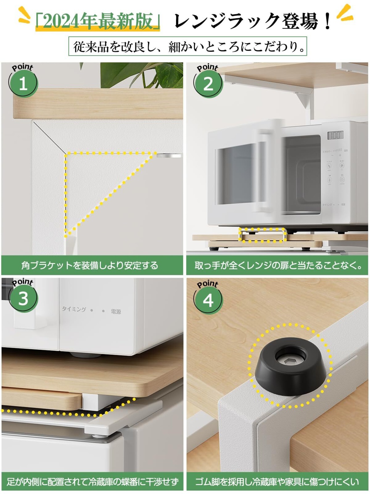 【キズや汚れに強いメラミン加工】キッチンは日々の調理や生活で汚れやすい場所。汚れにくく、耐水性に優れた低圧メラミン化粧板を使用、汚れてもサッと拭くだけだから、お手入れラクラク。フレームは防錆性・耐熱性・耐油性に優れた粉体塗装仕上げで、水回りやキッチンでもキレイが長持ち。レンジ棚の足が内側に配置されているので、冷蔵庫の蝶番に干渉せず、バルミューダレンジなどもサイズピッタリで完璧な配置になれます。また、ゴム脚を採用し、冷蔵庫や家具に傷つけにくいです。