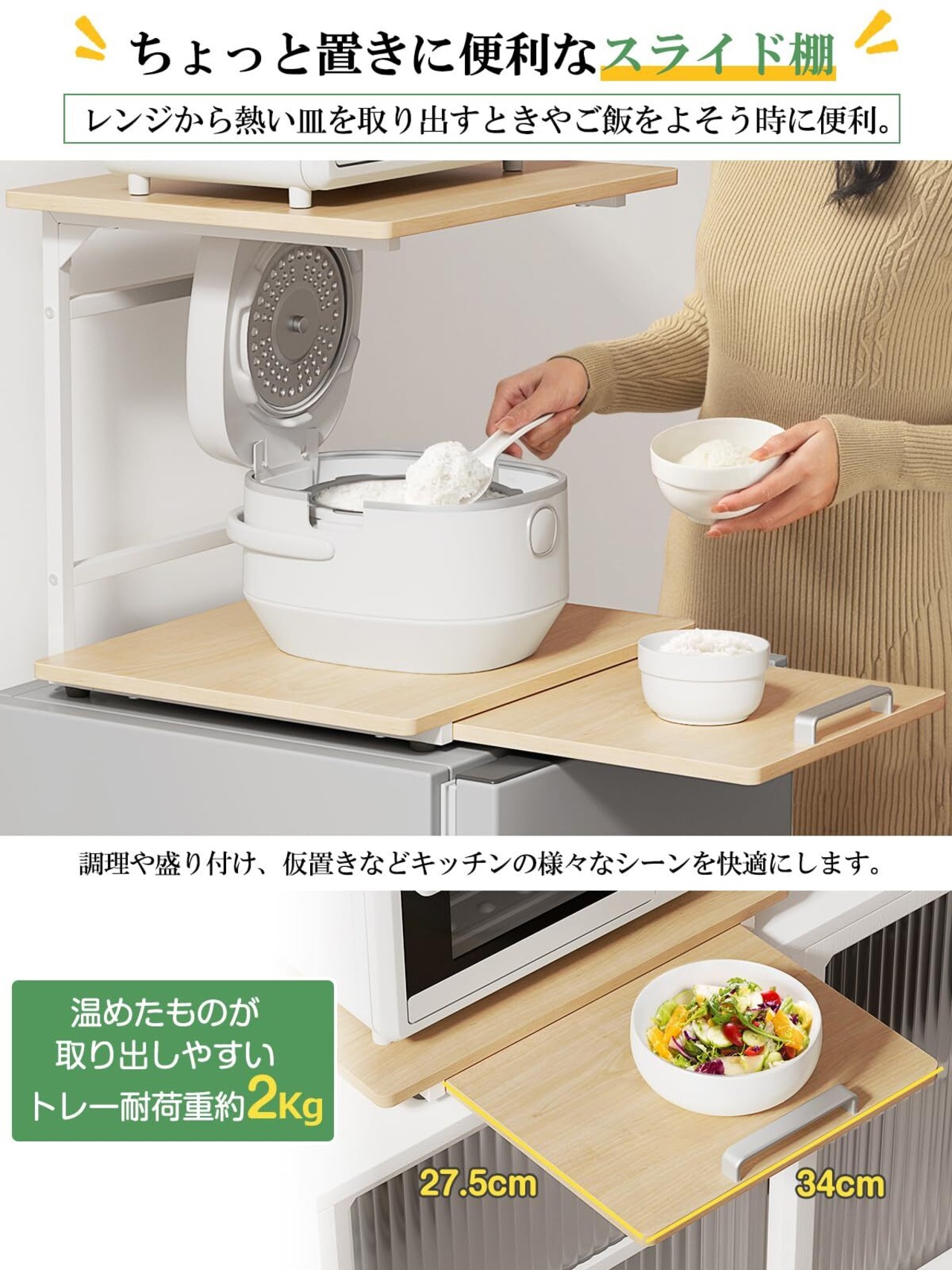 【ちょっと置きに便利なスライド棚】料理の一時置きができるスライド棚は、レンジから熱いお皿取り出すときにも便利。片手でサッと引き出すだけで、「ちょい置き」スペースに。料理の盛り付けや下準備、調理器具・食材の仮置きなど、調理のさまざまなシーンで大活躍スライド式ラック。取っ手がコンパクトで全くレンジの扉と当たることなく。スライドトレーは最大約28cm引き出せます。