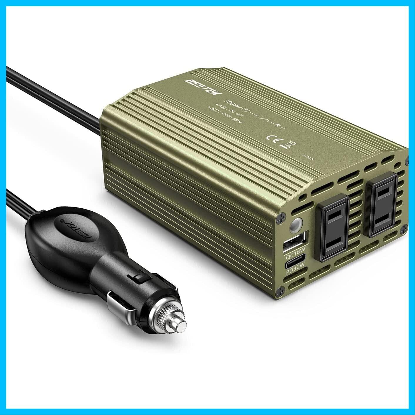 BESTEK インバーター 定額300W 12V シガーソケット コンセント 300W DC12VをAC100Vに変換 USB2ポート搭載 12V車専用 PD1ポート搭載 PD出力対応 カーインバーター 車載用インバーター グリーン系 MRI3010BU-GR-PD30W