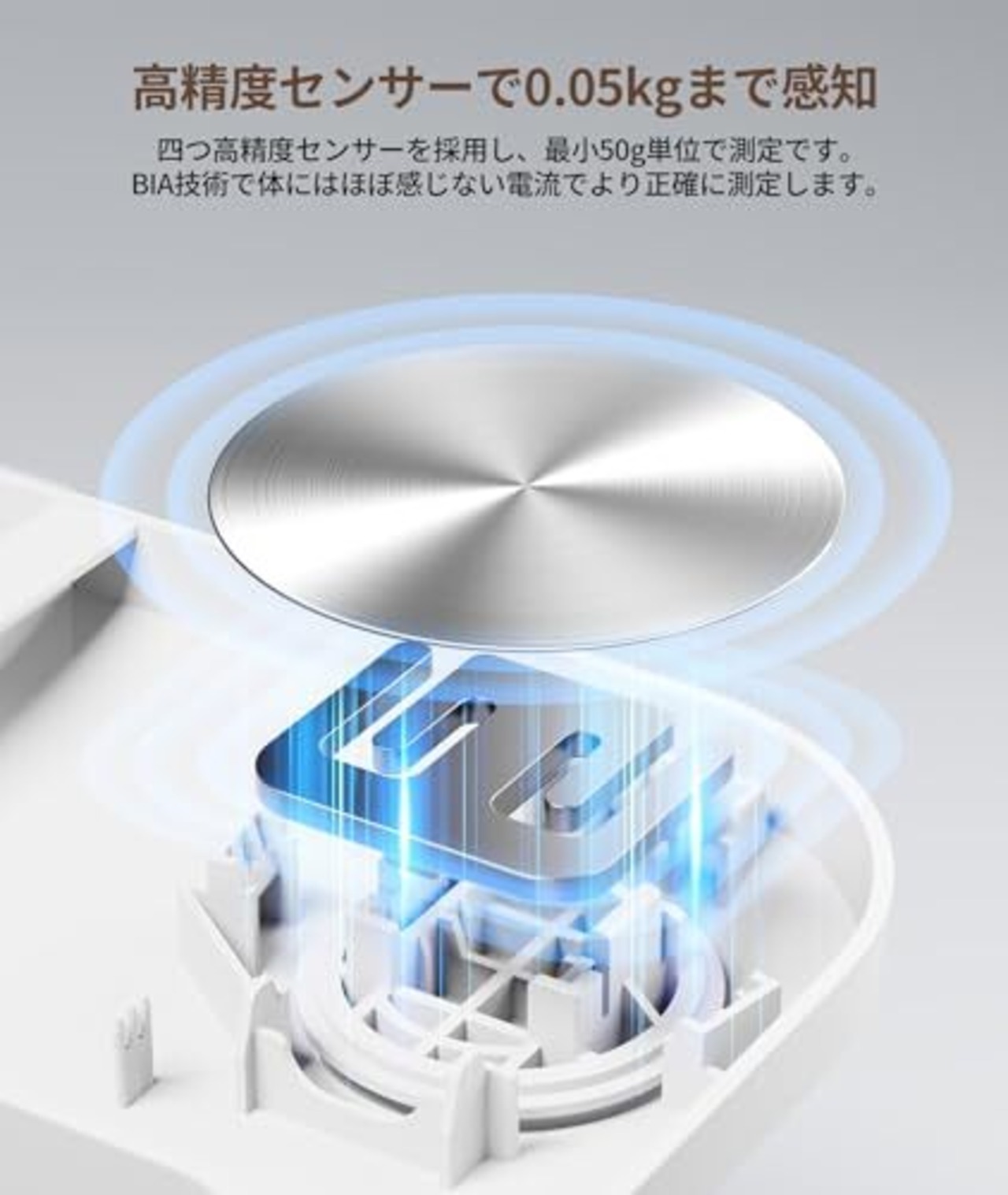 【BIA技術+高精度センサー搭載】生体電気インピーダンス分析法(BIA)を採用。4箇所に配置した高感度電極が体内の水分分布を解析。最小0.05kg単位までのプロ仕様精度を家庭で実現されます。