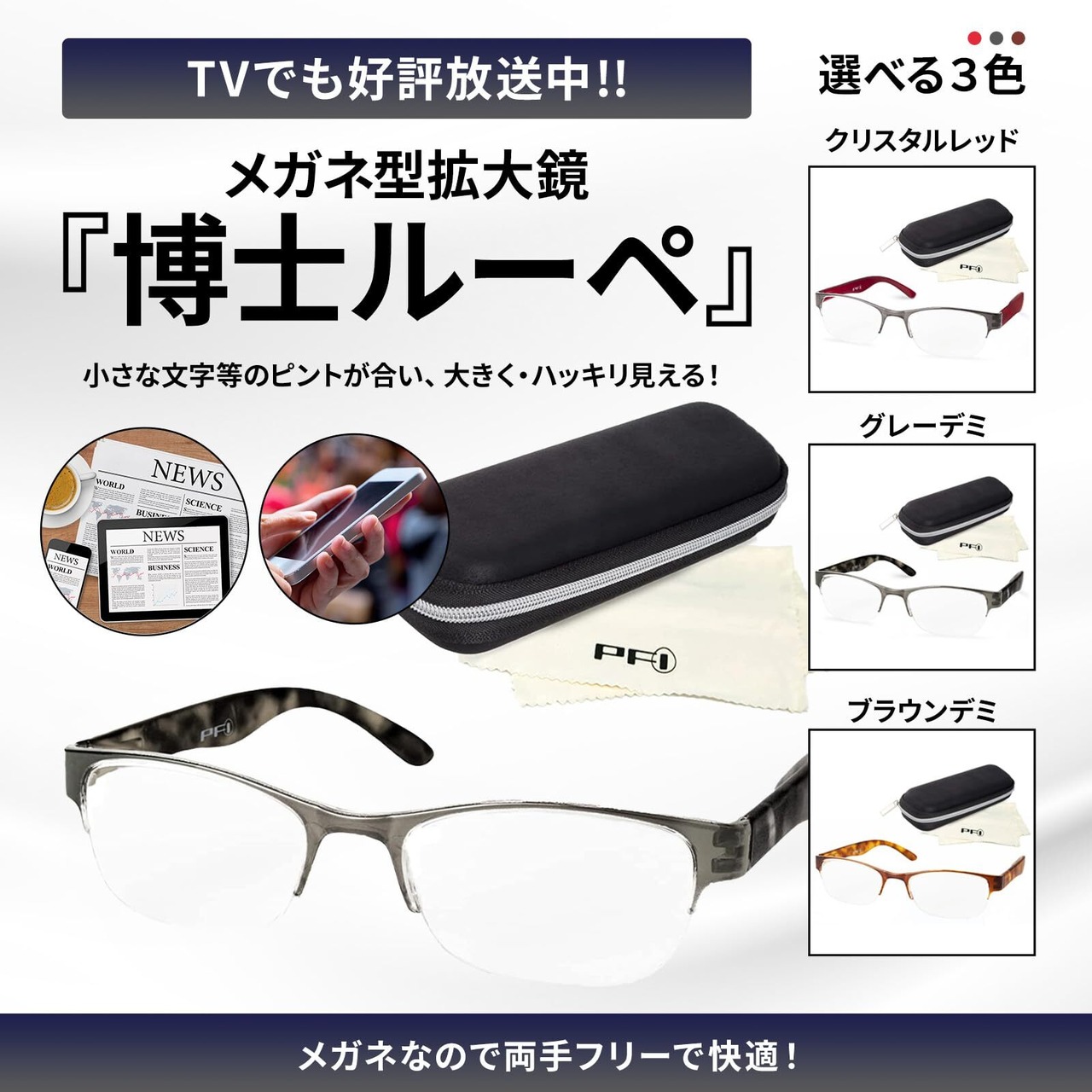 【 博士ルーペ 約2.0倍 グレーデミ 】 株式会社ファーマフーズ 拡大鏡 メガネ ルーペ 軽量 ソフトフレーム 専用ケース付 21g 伸縮性 耐久性 シリアルナンバー付