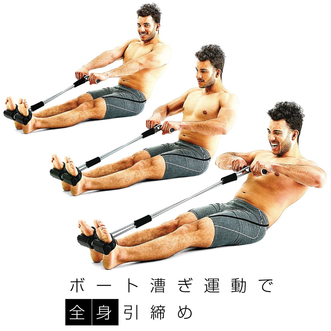 ローイングチューブとしてボート漕ぎ運動に最適。腹筋、背筋、腕、体幹を鍛え、消費カロリーが高いボート漕ぎ運動。