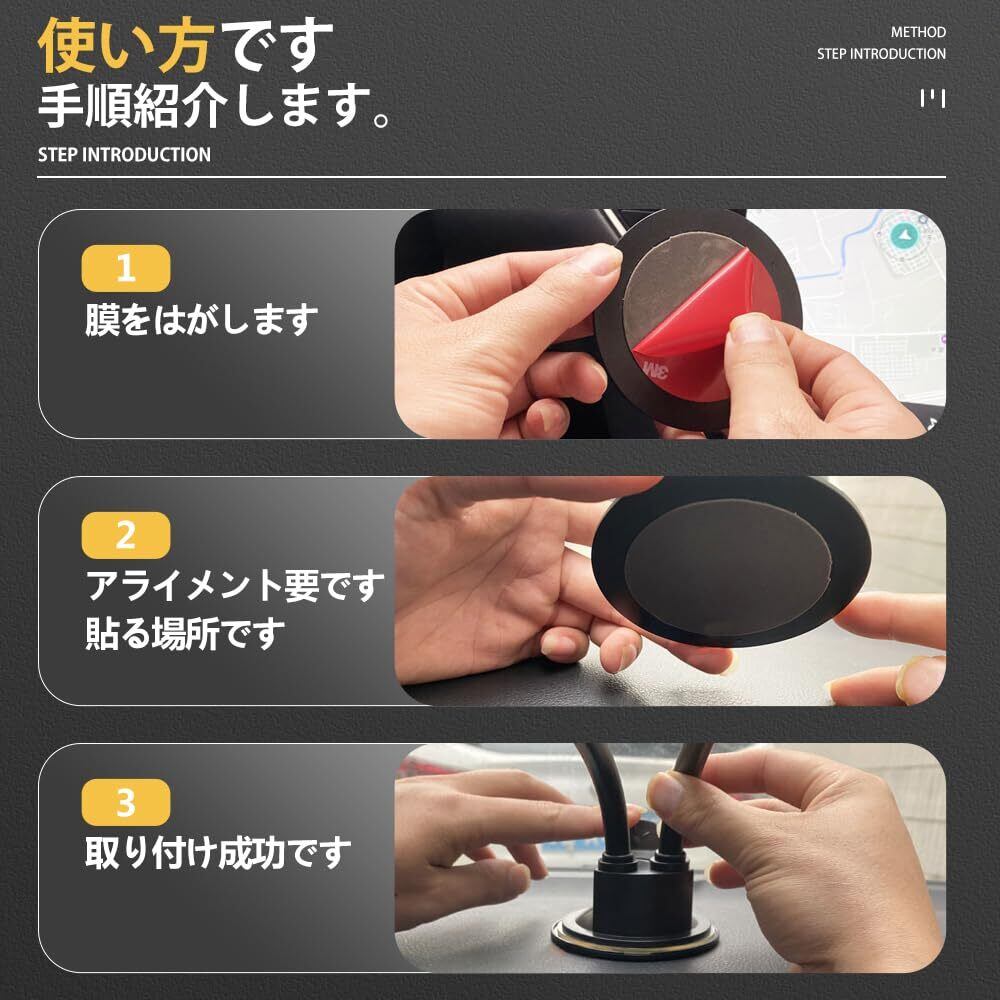 [簡単取り付け】 1.ダッシュボードをきれいにする 2.赤いフィルムをはがす 3.ダッシュボードに固定し、しっかり押す 4.しばらく放置すると使用できるようになります。