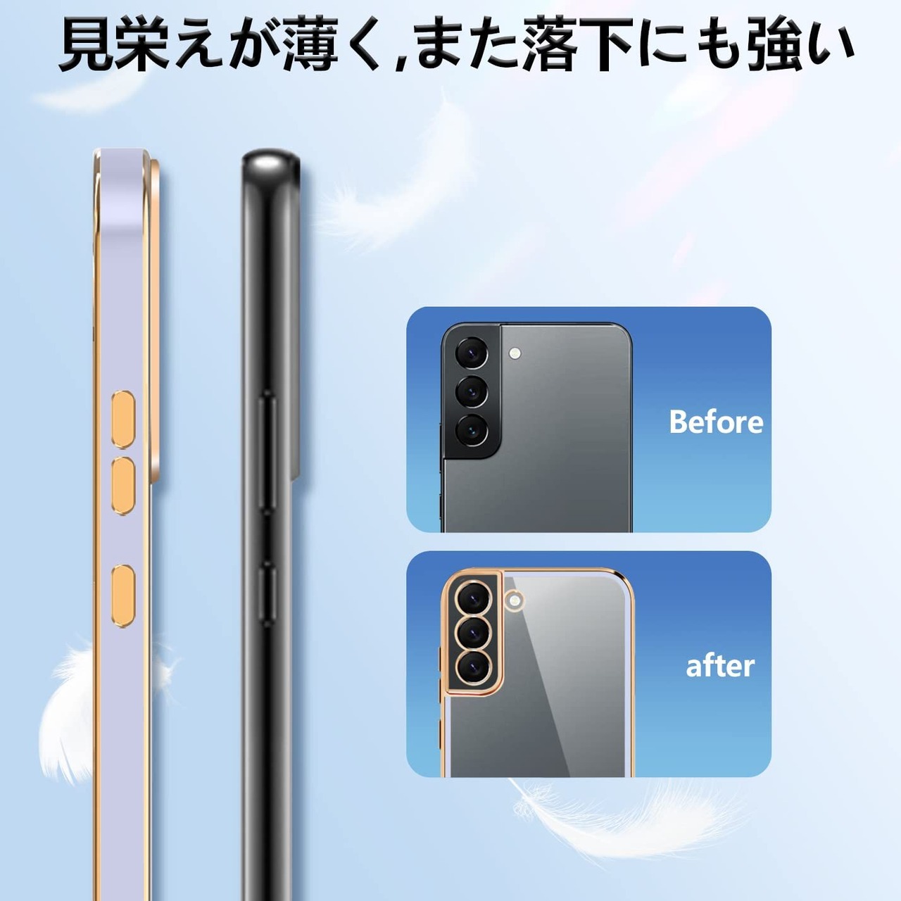 【スマホを輝かせるクリアケース】S22用ケースの背面は透き通った高い透明度を誇り、フレームは多層メッキ加工技術によって設計。 ゴールドラインに選べる上品なサイドカラーで端末本体にアクセントを付けてくれます。 裏面は透明の為、本体の色をそのまま映し出すことができ端末のオリジナルカラーを損ねません。ほんの少しのイメージチェンジ メタリックなサイドカラーが S22のデザインをさらに引き立ています。