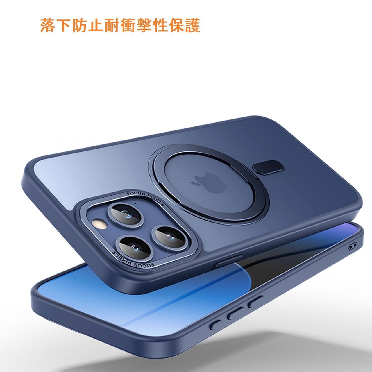 iPhoneSE3/SE2/SE/8/7 用 ケース Magsafe対応【360°回転可能な Magsafeリングスタンド ホルダー 一体型・ストラップ1種付き】アイフォンSE 第3/2世代 iPhone 8カバースタンド機能 縦横両対応 HILEGENERケース 耐衝撃 カメラレンズ保護 半透明 マット感 隠しスタンドケース ストラップホール付き あいほんSE3-ブルー