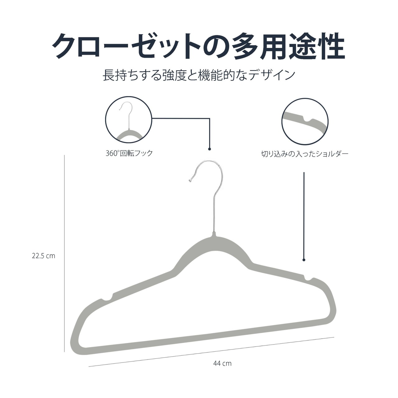 表面のベルベット素材と両肩部分のきりこみが衣類の落下を防ぎます。