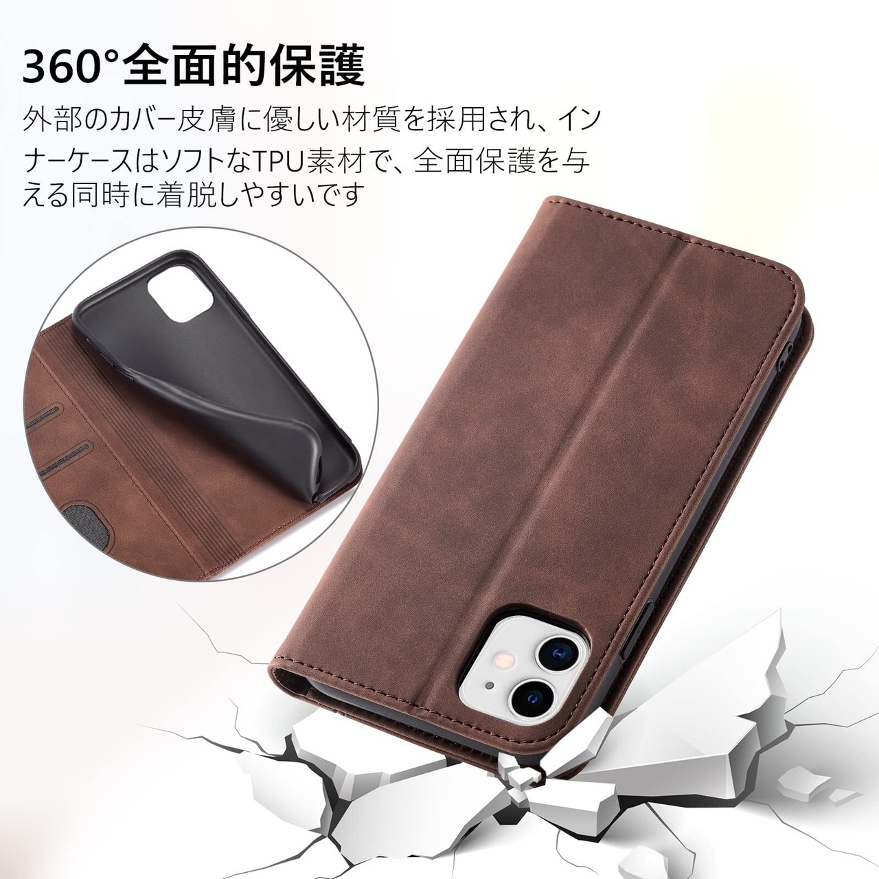 【衝撃吸収・360°保護】外部のカバーはiphone11よりも1mm以上広めに設計されており、落下時の衝撃を効果的に吸収してスマホへの直接的な外力を防ぐようになっています。スマホケースあいふぉん11インナーケースはソフトなTPU素材で、二重の保護として機能します。また、マグネットフラップを採用、アイフォン11 手帳型 ケースに搭載されているマグネット式のフリップにより、カバーをしっかり固定することができます。