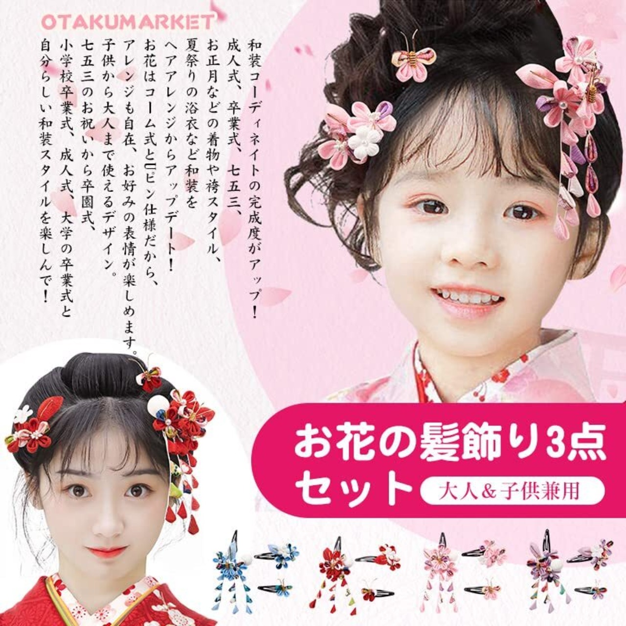 OTAKUMARKET 七五三 髪飾り 成人式 振袖 浴衣 和装 つまみ細工 髪 飾り 着物 髪飾り 袴 卒業式 結婚式 セット 三歳 七歳 女の子 ガールズ 5タイプ 4カラー (Bタイプ (ピンク))