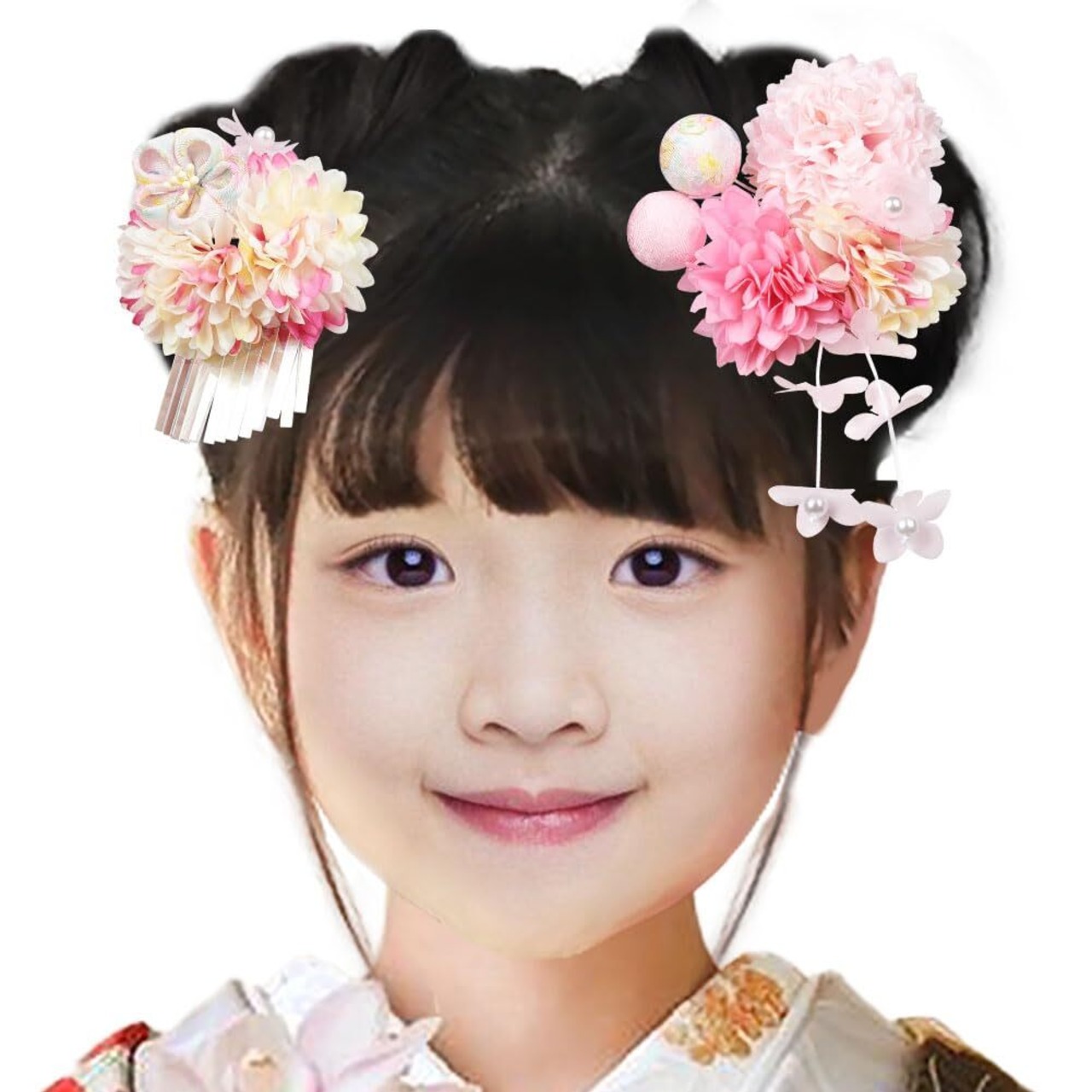 OTAKUMARKET 髪飾り 七五三 成人式 浴衣 髪 飾り 花 袴 着物 振袖 和装 卒業式 結婚式 髪留め 子供 和風 高級造花 ヘアアクセサリー 2点セット (ピンク A)